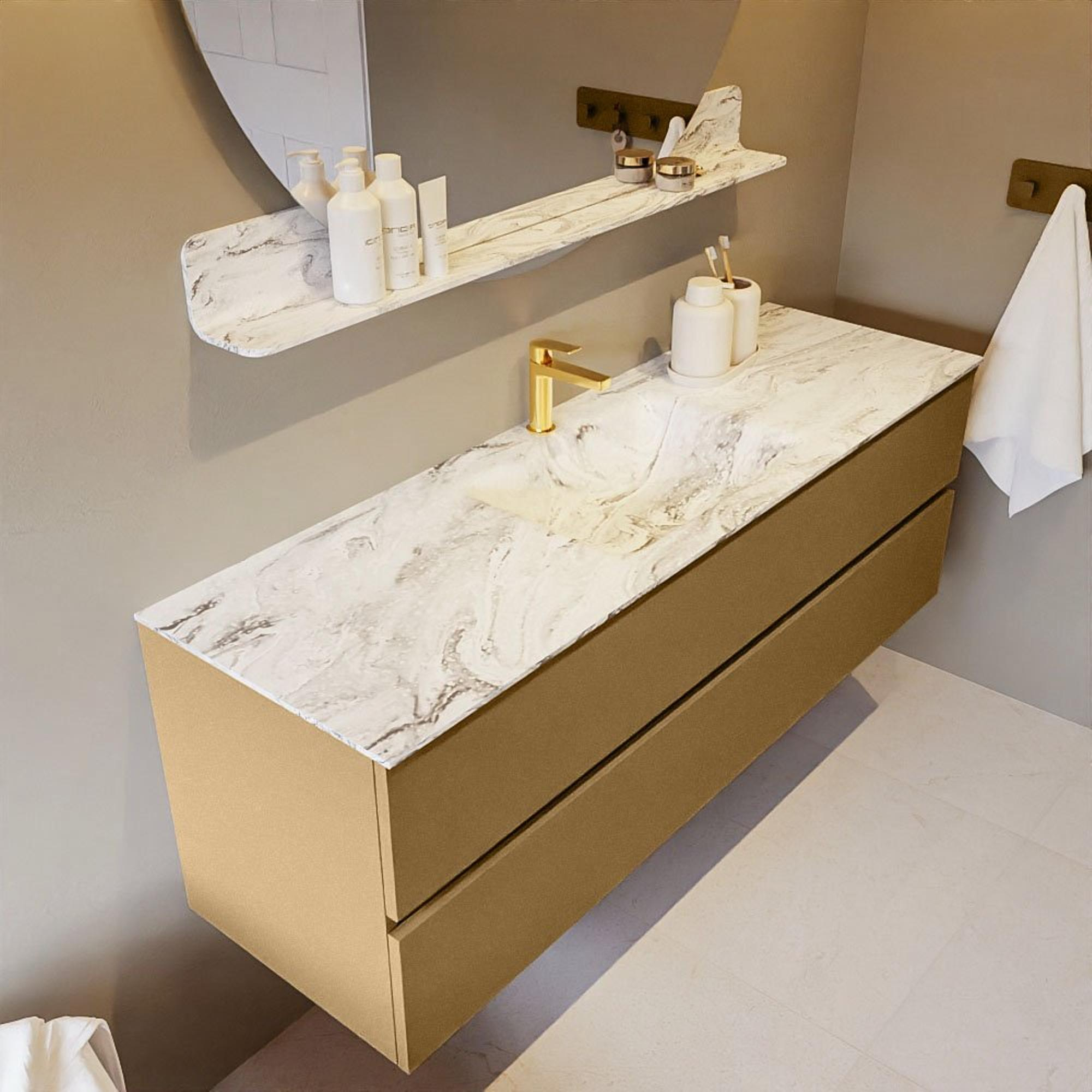 MONDIAZ VICA-DLUX Badkamermeubelset - 150cm - onderkast oro- 2 lades - inbouw wastafel cloud midden - 1 kraangat - 60cm hoge versie - glace