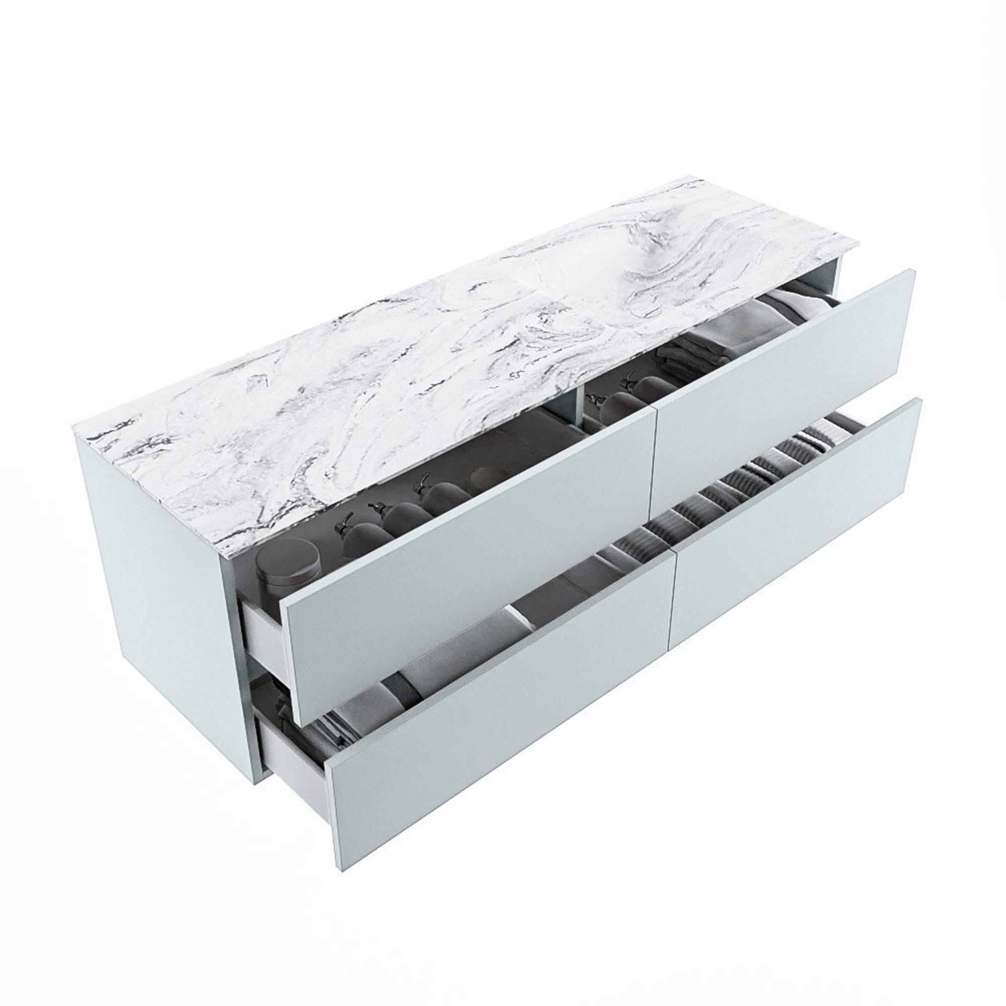 De buitengewone mooie badmeubel set VICA DLUX is een schitterend pronkstuk in uw badkamer. De gemarmerde Solid surface wastafel van CORIAN heeft een fraaie en tijdloze uitstraling. Door de zachte en natuurlijke vorm van de wastafel, gecombineerd met de tijdloze en prachtige badmeubel onderkast past de VICA-DLUX goed bij de diverse stijlen badkamers. Om uw badkamer compleet te af te stijlen hebben wij ook de nissen en spiegelhouders in dezelfde kleur als de wastafel. Zoals de Mondiaz nissen en spiegel planchetten. De serie VICA DLUX bestaat uit de 2 of 4 laden onderkast VICA gecombineerd met een CORIAN Solid surface wastafel met marmer structuur. De Solid surface CORIAN wastafel is in 5 marmer looks verkrijgbaar. Met deze badkamermeubel set heeft u wel die mooie marmeren uitstraling maar tevens ook het gemak en de hygiëne van Solid surface. Let op: U ziet bij de XL (60cm) variant de afbeeldingen/video's van de standaard hoogte (50cm)