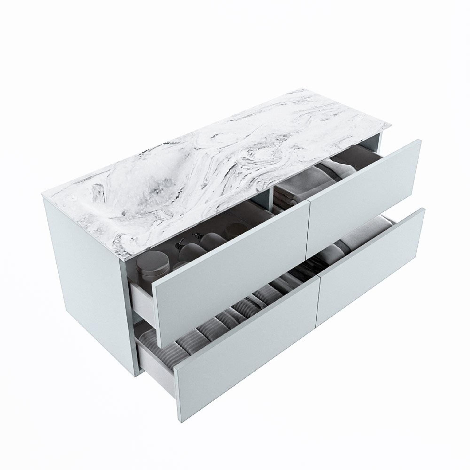 De buitengewone mooie badmeubel set VICA DLUX is een schitterend pronkstuk in uw badkamer. De gemarmerde Solid surface wastafel van CORIAN heeft een fraaie en tijdloze uitstraling. Door de zachte en natuurlijke vorm van de wastafel, gecombineerd met de tijdloze en prachtige badmeubel onderkast past de VICA-DLUX goed bij de diverse stijlen badkamers. Om uw badkamer compleet te af te stijlen hebben wij ook de nissen en spiegelhouders in dezelfde kleur als de wastafel. Zoals de Mondiaz nissen en spiegel planchetten. De serie VICA DLUX bestaat uit de 2 of 4 laden onderkast VICA gecombineerd met een CORIAN Solid surface wastafel met marmer structuur. De Solid surface CORIAN wastafel is in 5 marmer looks verkrijgbaar. Met deze badkamermeubel set heeft u wel die mooie marmeren uitstraling maar tevens ook het gemak en de hygiëne van Solid surface. Let op: U ziet bij de XL (60cm) variant de afbeeldingen/video's van de standaard hoogte (50cm)