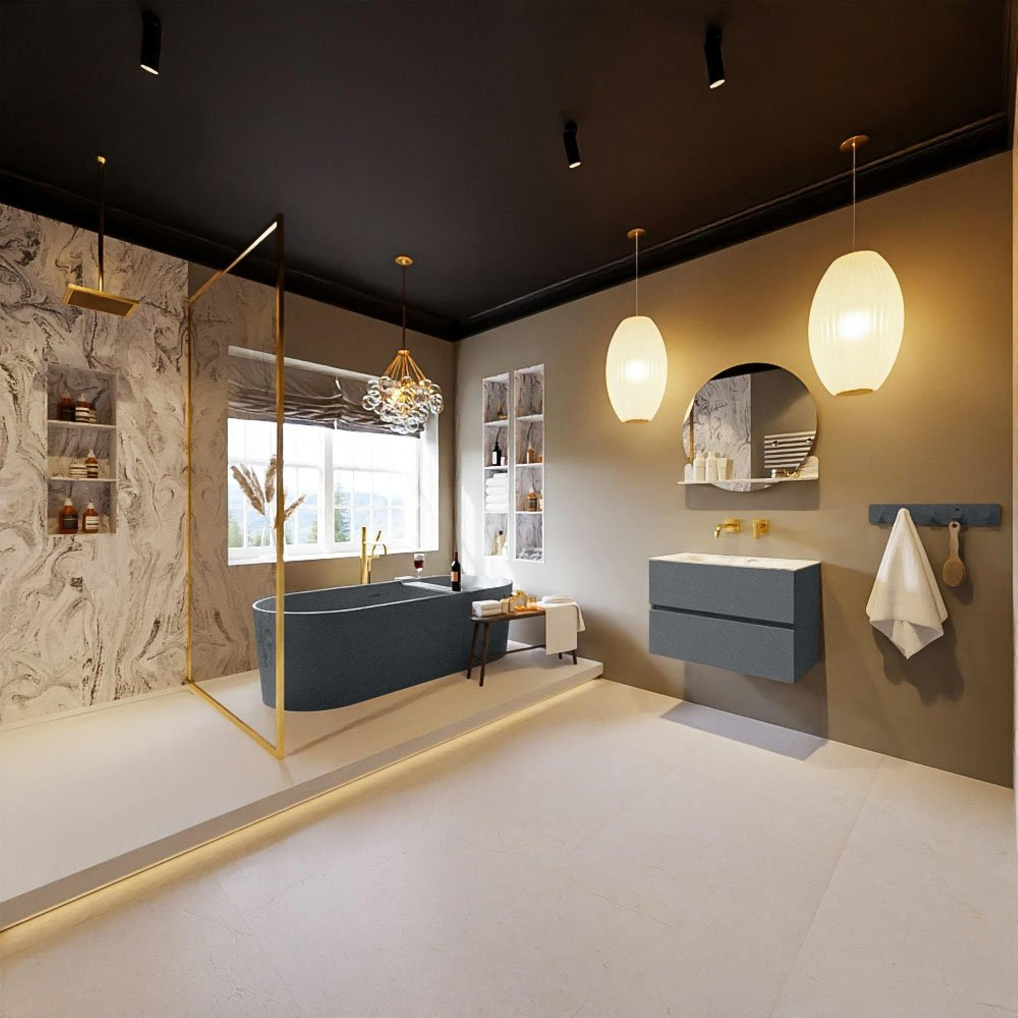 De buitengewone mooie badmeubel set VICA DLUX is een schitterend pronkstuk in uw badkamer. De gemarmerde Solid surface wastafel van CORIAN heeft een fraaie en tijdloze uitstraling. Door de zachte en natuurlijke vorm van de wastafel, gecombineerd met de tijdloze en prachtige badmeubel onderkast past de VICA-DLUX goed bij de diverse stijlen badkamers. Om uw badkamer compleet te af te stijlen hebben wij ook de nissen en spiegelhouders in dezelfde kleur als de wastafel. Zoals de Mondiaz nissen en spiegel planchetten. De serie VICA DLUX bestaat uit de 2 of 4 laden onderkast VICA gecombineerd met een CORIAN Solid surface wastafel met marmer structuur. De Solid surface CORIAN wastafel is in 5 marmer looks verkrijgbaar. Met deze badkamermeubel set heeft u wel die mooie marmeren uitstraling maar tevens ook het gemak en de hygiëne van Solid surface. Let op: U ziet bij de XL (60cm) variant de afbeeldingen/video's van de standaard hoogte (50cm)