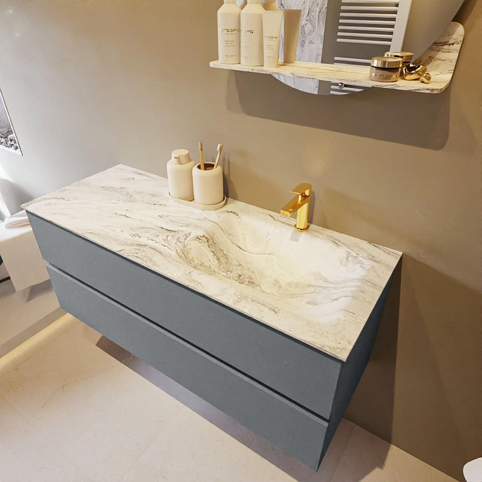 De buitengewone mooie badmeubel set VICA DLUX is een schitterend pronkstuk in uw badkamer. De gemarmerde Solid surface wastafel van CORIAN heeft een fraaie en tijdloze uitstraling. Door de zachte en natuurlijke vorm van de wastafel, gecombineerd met de tijdloze en prachtige badmeubel onderkast past de VICA-DLUX goed bij de diverse stijlen badkamers. Om uw badkamer compleet te af te stijlen hebben wij ook de nissen en spiegelhouders in dezelfde kleur als de wastafel. Zoals de Mondiaz nissen en spiegel planchetten. De serie VICA DLUX bestaat uit de 2 of 4 laden onderkast VICA gecombineerd met een CORIAN Solid surface wastafel met marmer structuur. De Solid surface CORIAN wastafel is in 5 marmer looks verkrijgbaar. Met deze badkamermeubel set heeft u wel die mooie marmeren uitstraling maar tevens ook het gemak en de hygiëne van Solid surface. Let op: U ziet bij de XL (60cm) variant de afbeeldingen/video's van de standaard hoogte (50cm)