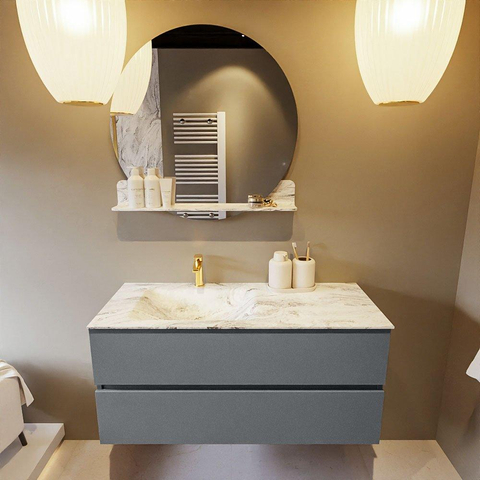 De buitengewone mooie badmeubel set VICA DLUX is een schitterend pronkstuk in uw badkamer. De gemarmerde Solid surface wastafel van CORIAN heeft een fraaie en tijdloze uitstraling. Door de zachte en natuurlijke vorm van de wastafel, gecombineerd met de tijdloze en prachtige badmeubel onderkast past de VICA-DLUX goed bij de diverse stijlen badkamers. Om uw badkamer compleet te af te stijlen hebben wij ook de nissen en spiegelhouders in dezelfde kleur als de wastafel. Zoals de Mondiaz nissen en spiegel planchetten. De serie VICA DLUX bestaat uit de 2 of 4 laden onderkast VICA gecombineerd met een CORIAN Solid surface wastafel met marmer structuur. De Solid surface CORIAN wastafel is in 5 marmer looks verkrijgbaar. Met deze badkamermeubel set heeft u wel die mooie marmeren uitstraling maar tevens ook het gemak en de hygiëne van Solid surface. Let op: U ziet bij de XL (60cm) variant de afbeeldingen/video's van de standaard hoogte (50cm)