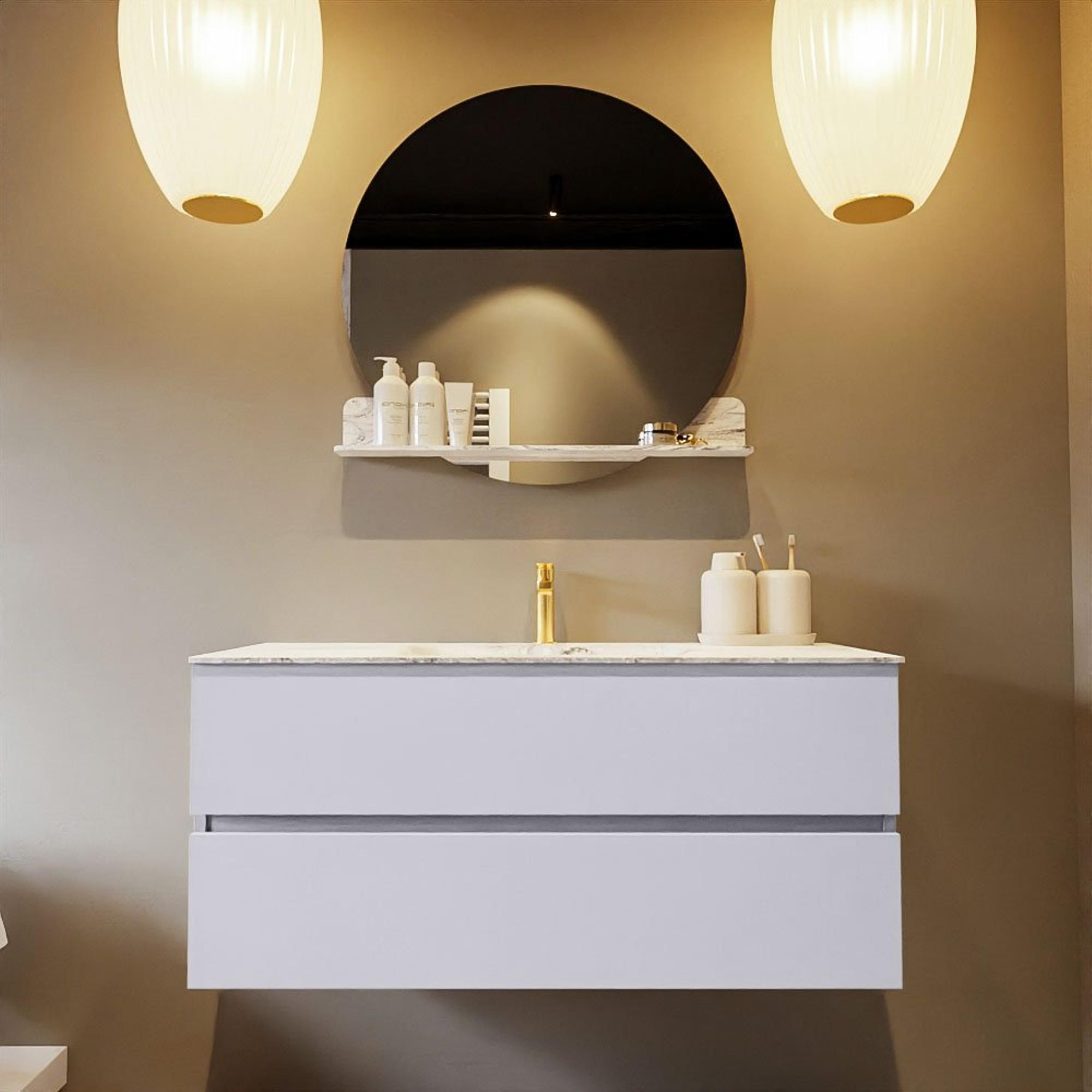 De buitengewone mooie badmeubel set VICA DLUX is een schitterend pronkstuk in uw badkamer. De gemarmerde Solid surface wastafel van CORIAN heeft een fraaie en tijdloze uitstraling. Door de zachte en natuurlijke vorm van de wastafel, gecombineerd met de tijdloze en prachtige badmeubel onderkast past de VICA-DLUX goed bij de diverse stijlen badkamers. Om uw badkamer compleet te af te stijlen hebben wij ook de nissen en spiegelhouders in dezelfde kleur als de wastafel. Zoals de Mondiaz nissen en spiegel planchetten. De serie VICA DLUX bestaat uit de 2 of 4 laden onderkast VICA gecombineerd met een CORIAN Solid surface wastafel met marmer structuur. De Solid surface CORIAN wastafel is in 5 marmer looks verkrijgbaar. Met deze badkamermeubel set heeft u wel die mooie marmeren uitstraling maar tevens ook het gemak en de hygiëne van Solid surface. Let op: U ziet bij de XL (60cm) variant de afbeeldingen/video's van de standaard hoogte (50cm)