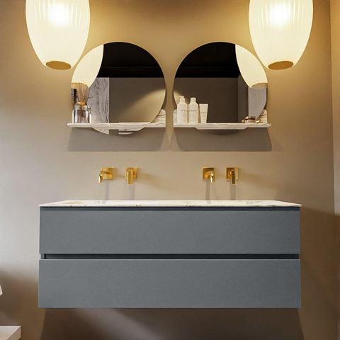 De buitengewone mooie badmeubel set VICA DLUX is een schitterend pronkstuk in uw badkamer. De gemarmerde Solid surface wastafel van CORIAN heeft een fraaie en tijdloze uitstraling. Door de zachte en natuurlijke vorm van de wastafel, gecombineerd met de tijdloze en prachtige badmeubel onderkast past de VICA-DLUX goed bij de diverse stijlen badkamers. Om uw badkamer compleet te af te stijlen hebben wij ook de nissen en spiegelhouders in dezelfde kleur als de wastafel. Zoals de Mondiaz nissen en spiegel planchetten. De serie VICA DLUX bestaat uit de 2 of 4 laden onderkast VICA gecombineerd met een CORIAN Solid surface wastafel met marmer structuur. De Solid surface CORIAN wastafel is in 5 marmer looks verkrijgbaar. Met deze badkamermeubel set heeft u wel die mooie marmeren uitstraling maar tevens ook het gemak en de hygiëne van Solid surface. Let op: U ziet bij de XL (60cm) variant de afbeeldingen/video's van de standaard hoogte (50cm)