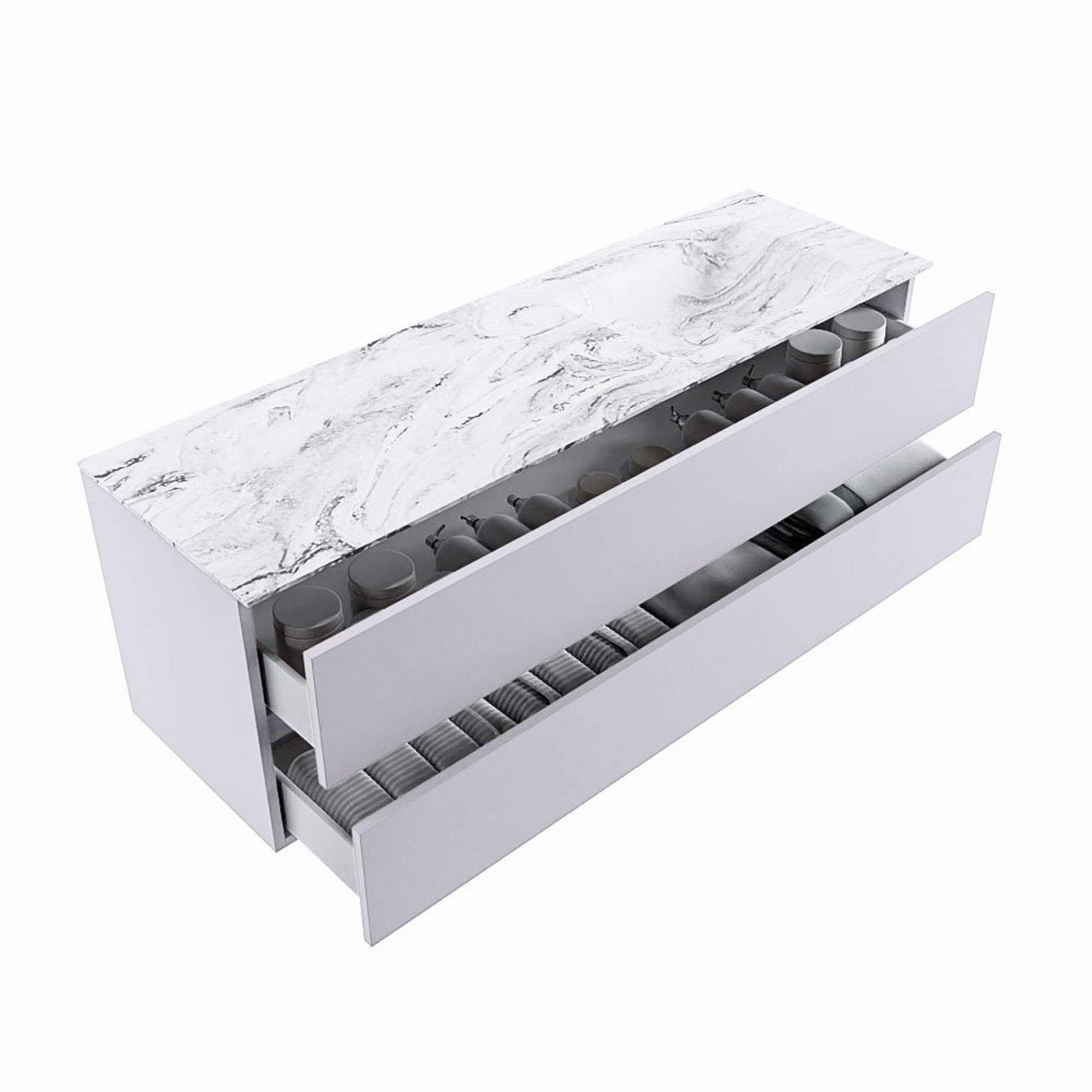 De buitengewone mooie badmeubel set VICA DLUX is een schitterend pronkstuk in uw badkamer. De gemarmerde Solid surface wastafel van CORIAN heeft een fraaie en tijdloze uitstraling. Door de zachte en natuurlijke vorm van de wastafel, gecombineerd met de tijdloze en prachtige badmeubel onderkast past de VICA-DLUX goed bij de diverse stijlen badkamers. Om uw badkamer compleet te af te stijlen hebben wij ook de nissen en spiegelhouders in dezelfde kleur als de wastafel. Zoals de Mondiaz nissen en spiegel planchetten. De serie VICA DLUX bestaat uit de 2 of 4 laden onderkast VICA gecombineerd met een CORIAN Solid surface wastafel met marmer structuur. De Solid surface CORIAN wastafel is in 5 marmer looks verkrijgbaar. Met deze badkamermeubel set heeft u wel die mooie marmeren uitstraling maar tevens ook het gemak en de hygiëne van Solid surface. Let op: U ziet bij de XL (60cm) variant de afbeeldingen/video's van de standaard hoogte (50cm)