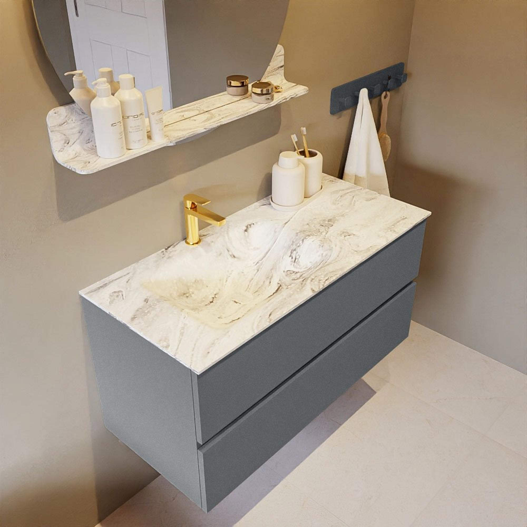 De buitengewone mooie badmeubel set VICA DLUX is een schitterend pronkstuk in uw badkamer. De gemarmerde Solid surface wastafel van CORIAN heeft een fraaie en tijdloze uitstraling. Door de zachte en natuurlijke vorm van de wastafel, gecombineerd met de tijdloze en prachtige badmeubel onderkast past de VICA-DLUX goed bij de diverse stijlen badkamers. Om uw badkamer compleet te af te stijlen hebben wij ook de nissen en spiegelhouders in dezelfde kleur als de wastafel. Zoals de Mondiaz nissen en spiegel planchetten. De serie VICA DLUX bestaat uit de 2 of 4 laden onderkast VICA gecombineerd met een CORIAN Solid surface wastafel met marmer structuur. De Solid surface CORIAN wastafel is in 5 marmer looks verkrijgbaar. Met deze badkamermeubel set heeft u wel die mooie marmeren uitstraling maar tevens ook het gemak en de hygiëne van Solid surface. Let op: U ziet bij de XL (60cm) variant de afbeeldingen/video's van de standaard hoogte (50cm)