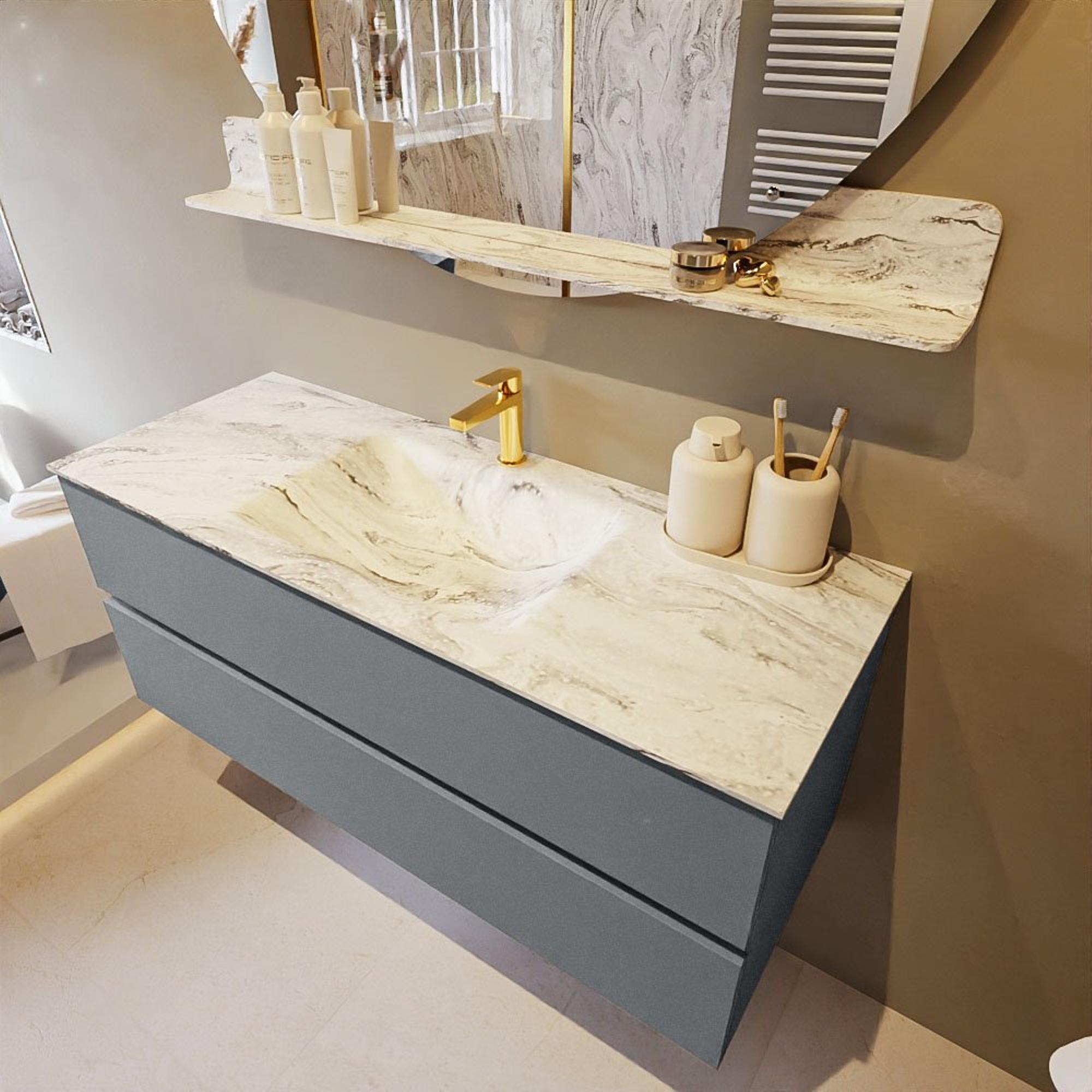 De buitengewone mooie badmeubel set VICA DLUX is een schitterend pronkstuk in uw badkamer. De gemarmerde Solid surface wastafel van CORIAN heeft een fraaie en tijdloze uitstraling. Door de zachte en natuurlijke vorm van de wastafel, gecombineerd met de tijdloze en prachtige badmeubel onderkast past de VICA-DLUX goed bij de diverse stijlen badkamers. Om uw badkamer compleet te af te stijlen hebben wij ook de nissen en spiegelhouders in dezelfde kleur als de wastafel. Zoals de Mondiaz nissen en spiegel planchetten. De serie VICA DLUX bestaat uit de 2 of 4 laden onderkast VICA gecombineerd met een CORIAN Solid surface wastafel met marmer structuur. De Solid surface CORIAN wastafel is in 5 marmer looks verkrijgbaar. Met deze badkamermeubel set heeft u wel die mooie marmeren uitstraling maar tevens ook het gemak en de hygiëne van Solid surface. Let op: U ziet bij de XL (60cm) variant de afbeeldingen/video's van de standaard hoogte (50cm)