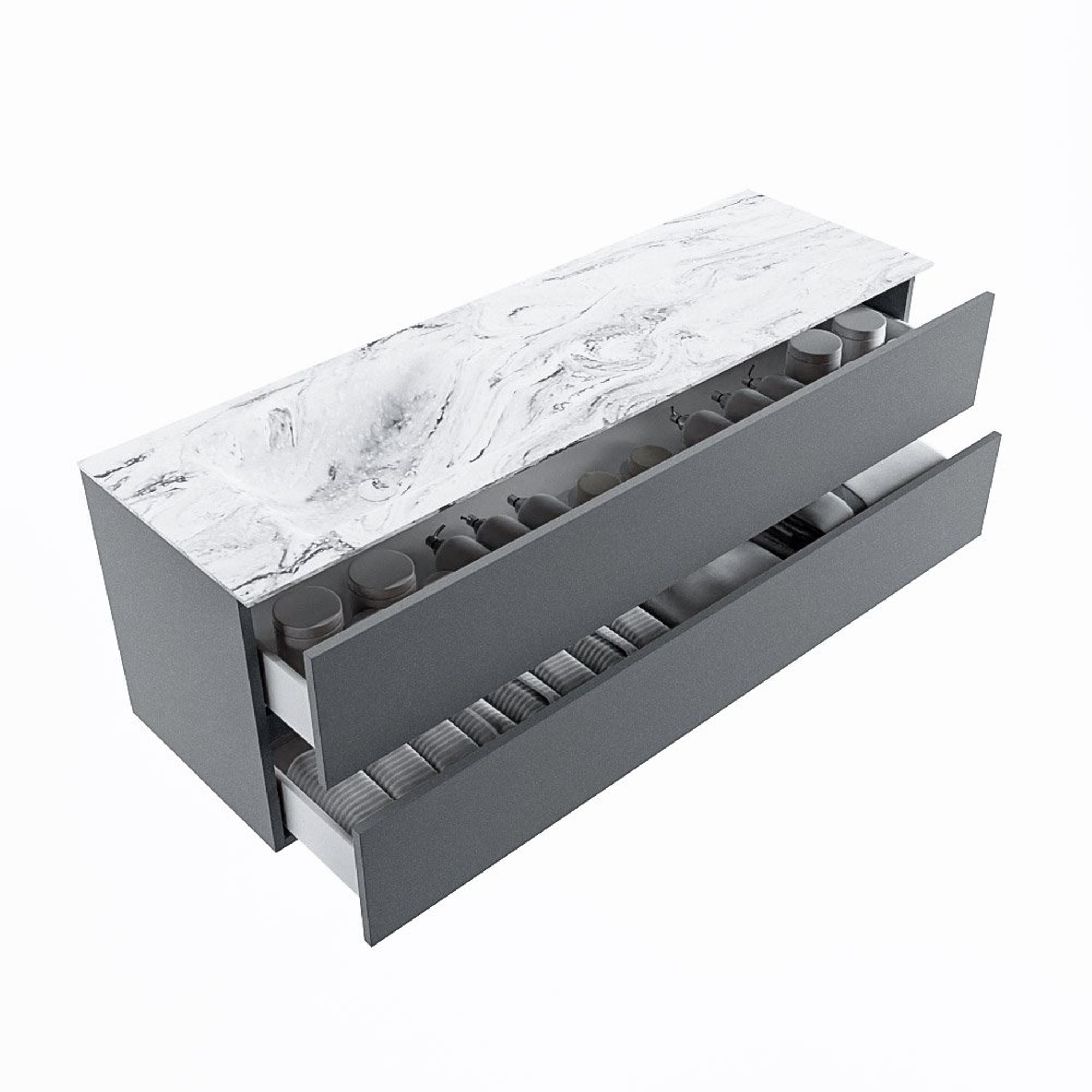 De buitengewone mooie badmeubel set VICA DLUX is een schitterend pronkstuk in uw badkamer. De gemarmerde Solid surface wastafel van CORIAN heeft een fraaie en tijdloze uitstraling. Door de zachte en natuurlijke vorm van de wastafel, gecombineerd met de tijdloze en prachtige badmeubel onderkast past de VICA-DLUX goed bij de diverse stijlen badkamers. Om uw badkamer compleet te af te stijlen hebben wij ook de nissen en spiegelhouders in dezelfde kleur als de wastafel. Zoals de Mondiaz nissen en spiegel planchetten. De serie VICA DLUX bestaat uit de 2 of 4 laden onderkast VICA gecombineerd met een CORIAN Solid surface wastafel met marmer structuur. De Solid surface CORIAN wastafel is in 5 marmer looks verkrijgbaar. Met deze badkamermeubel set heeft u wel die mooie marmeren uitstraling maar tevens ook het gemak en de hygiëne van Solid surface. Let op: U ziet bij de XL (60cm) variant de afbeeldingen/video's van de standaard hoogte (50cm)