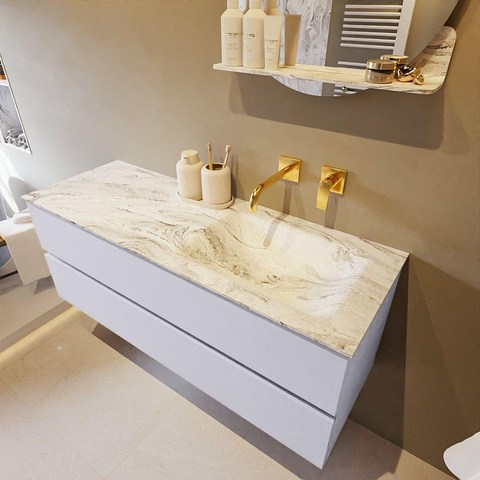 De buitengewone mooie badmeubel set VICA DLUX is een schitterend pronkstuk in uw badkamer. De gemarmerde Solid surface wastafel van CORIAN heeft een fraaie en tijdloze uitstraling. Door de zachte en natuurlijke vorm van de wastafel, gecombineerd met de tijdloze en prachtige badmeubel onderkast past de VICA-DLUX goed bij de diverse stijlen badkamers. Om uw badkamer compleet te af te stijlen hebben wij ook de nissen en spiegelhouders in dezelfde kleur als de wastafel. Zoals de Mondiaz nissen en spiegel planchetten. De serie VICA DLUX bestaat uit de 2 of 4 laden onderkast VICA gecombineerd met een CORIAN Solid surface wastafel met marmer structuur. De Solid surface CORIAN wastafel is in 5 marmer looks verkrijgbaar. Met deze badkamermeubel set heeft u wel die mooie marmeren uitstraling maar tevens ook het gemak en de hygiëne van Solid surface. Let op: U ziet bij de XL (60cm) variant de afbeeldingen/video's van de standaard hoogte (50cm)