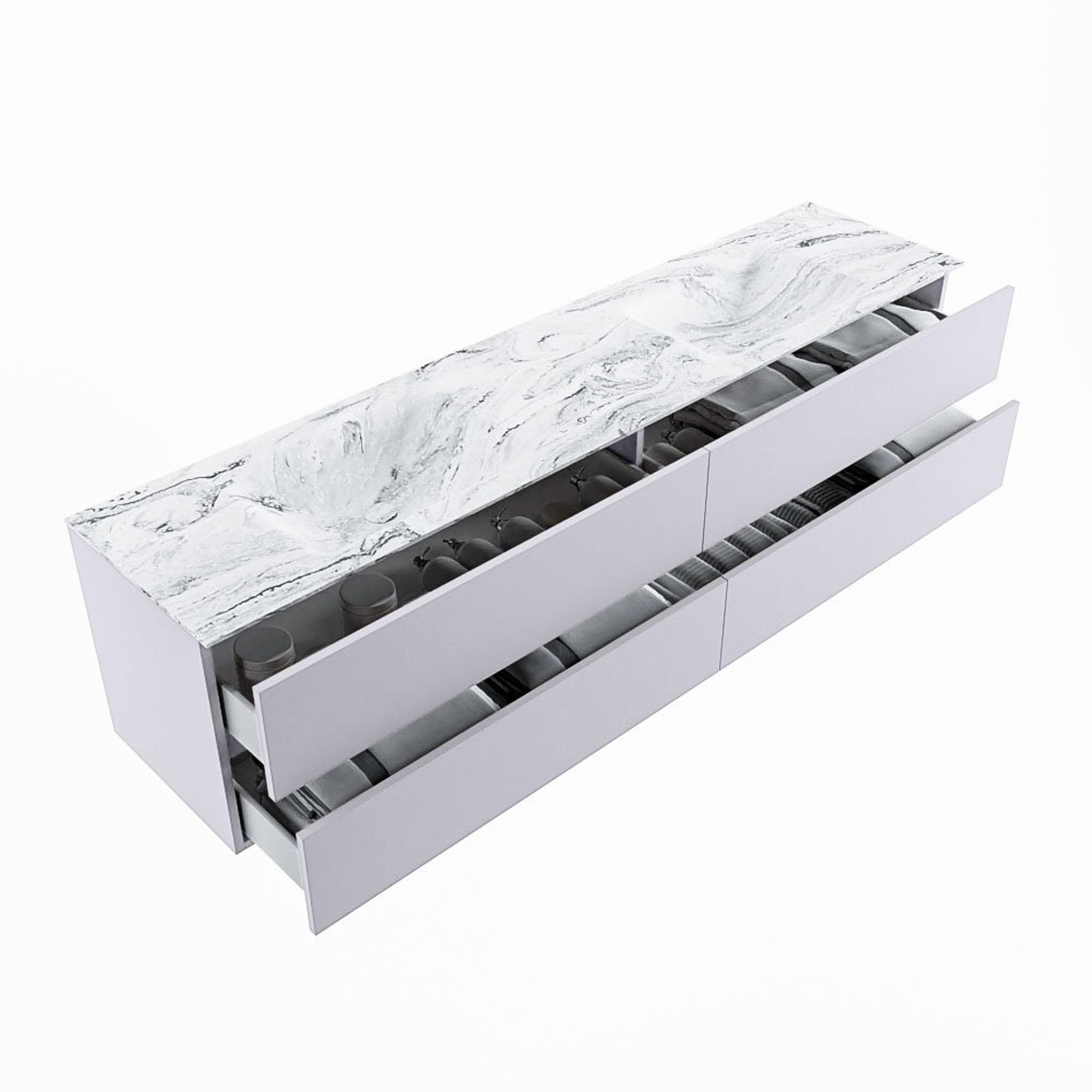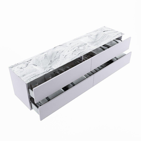 De buitengewone mooie badmeubel set VICA DLUX is een schitterend pronkstuk in uw badkamer. De gemarmerde Solid surface wastafel van CORIAN heeft een fraaie en tijdloze uitstraling. Door de zachte en natuurlijke vorm van de wastafel, gecombineerd met de tijdloze en prachtige badmeubel onderkast past de VICA-DLUX goed bij de diverse stijlen badkamers. Om uw badkamer compleet te af te stijlen hebben wij ook de nissen en spiegelhouders in dezelfde kleur als de wastafel. Zoals de Mondiaz nissen en spiegel planchetten. De serie VICA DLUX bestaat uit de 2 of 4 laden onderkast VICA gecombineerd met een CORIAN Solid surface wastafel met marmer structuur. De Solid surface CORIAN wastafel is in 5 marmer looks verkrijgbaar. Met deze badkamermeubel set heeft u wel die mooie marmeren uitstraling maar tevens ook het gemak en de hygiëne van Solid surface. Let op: U ziet bij de XL (60cm) variant de afbeeldingen/video's van de standaard hoogte (50cm)