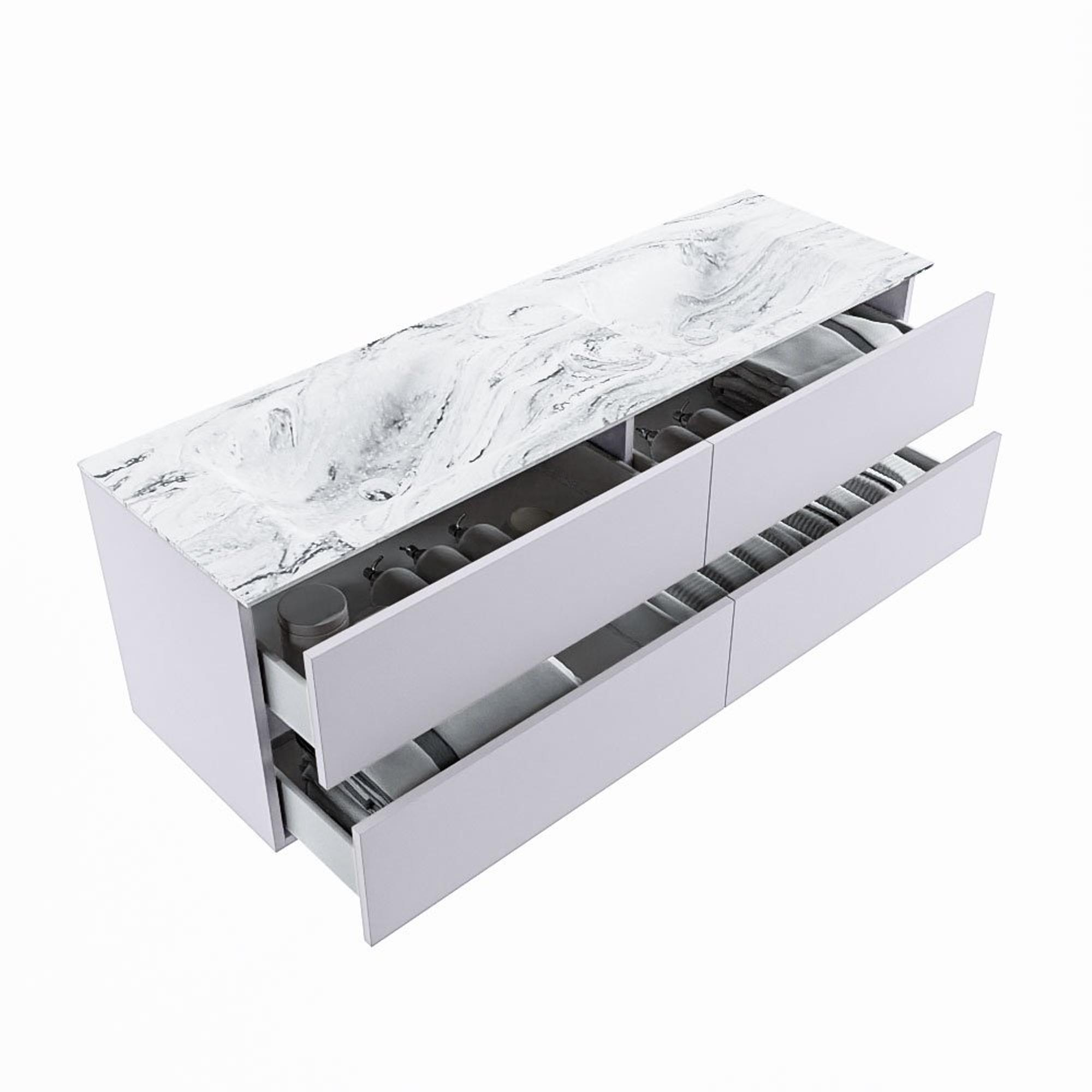 De buitengewone mooie badmeubel set VICA DLUX is een schitterend pronkstuk in uw badkamer. De gemarmerde Solid surface wastafel van CORIAN heeft een fraaie en tijdloze uitstraling. Door de zachte en natuurlijke vorm van de wastafel, gecombineerd met de tijdloze en prachtige badmeubel onderkast past de VICA-DLUX goed bij de diverse stijlen badkamers. Om uw badkamer compleet te af te stijlen hebben wij ook de nissen en spiegelhouders in dezelfde kleur als de wastafel. Zoals de Mondiaz nissen en spiegel planchetten. De serie VICA DLUX bestaat uit de 2 of 4 laden onderkast VICA gecombineerd met een CORIAN Solid surface wastafel met marmer structuur. De Solid surface CORIAN wastafel is in 5 marmer looks verkrijgbaar. Met deze badkamermeubel set heeft u wel die mooie marmeren uitstraling maar tevens ook het gemak en de hygiëne van Solid surface. Let op: U ziet bij de XL (60cm) variant de afbeeldingen/video's van de standaard hoogte (50cm)