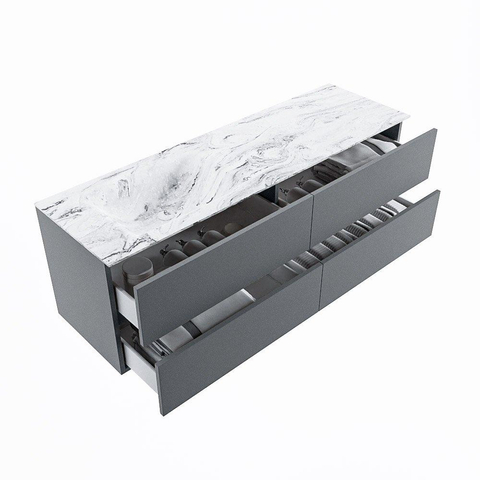 De buitengewone mooie badmeubel set VICA DLUX is een schitterend pronkstuk in uw badkamer. De gemarmerde Solid surface wastafel van CORIAN heeft een fraaie en tijdloze uitstraling. Door de zachte en natuurlijke vorm van de wastafel, gecombineerd met de tijdloze en prachtige badmeubel onderkast past de VICA-DLUX goed bij de diverse stijlen badkamers. Om uw badkamer compleet te af te stijlen hebben wij ook de nissen en spiegelhouders in dezelfde kleur als de wastafel. Zoals de Mondiaz nissen en spiegel planchetten. De serie VICA DLUX bestaat uit de 2 of 4 laden onderkast VICA gecombineerd met een CORIAN Solid surface wastafel met marmer structuur. De Solid surface CORIAN wastafel is in 5 marmer looks verkrijgbaar. Met deze badkamermeubel set heeft u wel die mooie marmeren uitstraling maar tevens ook het gemak en de hygiëne van Solid surface. Let op: U ziet bij de XL (60cm) variant de afbeeldingen/video's van de standaard hoogte (50cm)