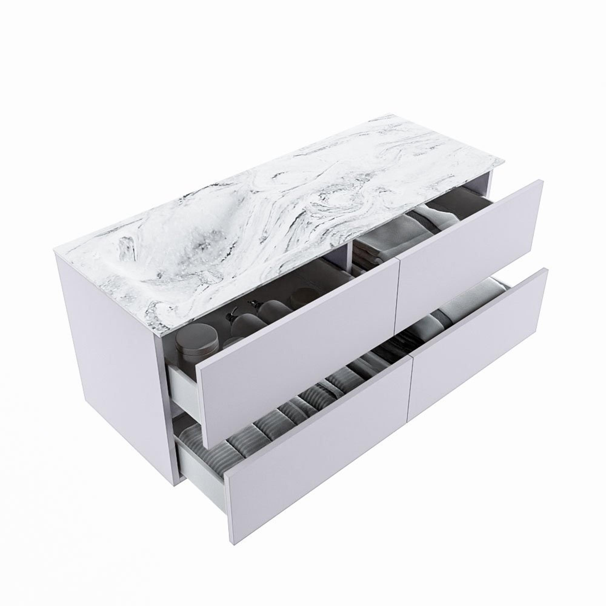 De buitengewone mooie badmeubel set VICA DLUX is een schitterend pronkstuk in uw badkamer. De gemarmerde Solid surface wastafel van CORIAN heeft een fraaie en tijdloze uitstraling. Door de zachte en natuurlijke vorm van de wastafel, gecombineerd met de tijdloze en prachtige badmeubel onderkast past de VICA-DLUX goed bij de diverse stijlen badkamers. Om uw badkamer compleet te af te stijlen hebben wij ook de nissen en spiegelhouders in dezelfde kleur als de wastafel. Zoals de Mondiaz nissen en spiegel planchetten. De serie VICA DLUX bestaat uit de 2 of 4 laden onderkast VICA gecombineerd met een CORIAN Solid surface wastafel met marmer structuur. De Solid surface CORIAN wastafel is in 5 marmer looks verkrijgbaar. Met deze badkamermeubel set heeft u wel die mooie marmeren uitstraling maar tevens ook het gemak en de hygiëne van Solid surface. Let op: U ziet bij de XL (60cm) variant de afbeeldingen/video's van de standaard hoogte (50cm)