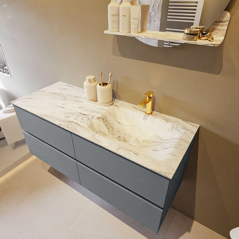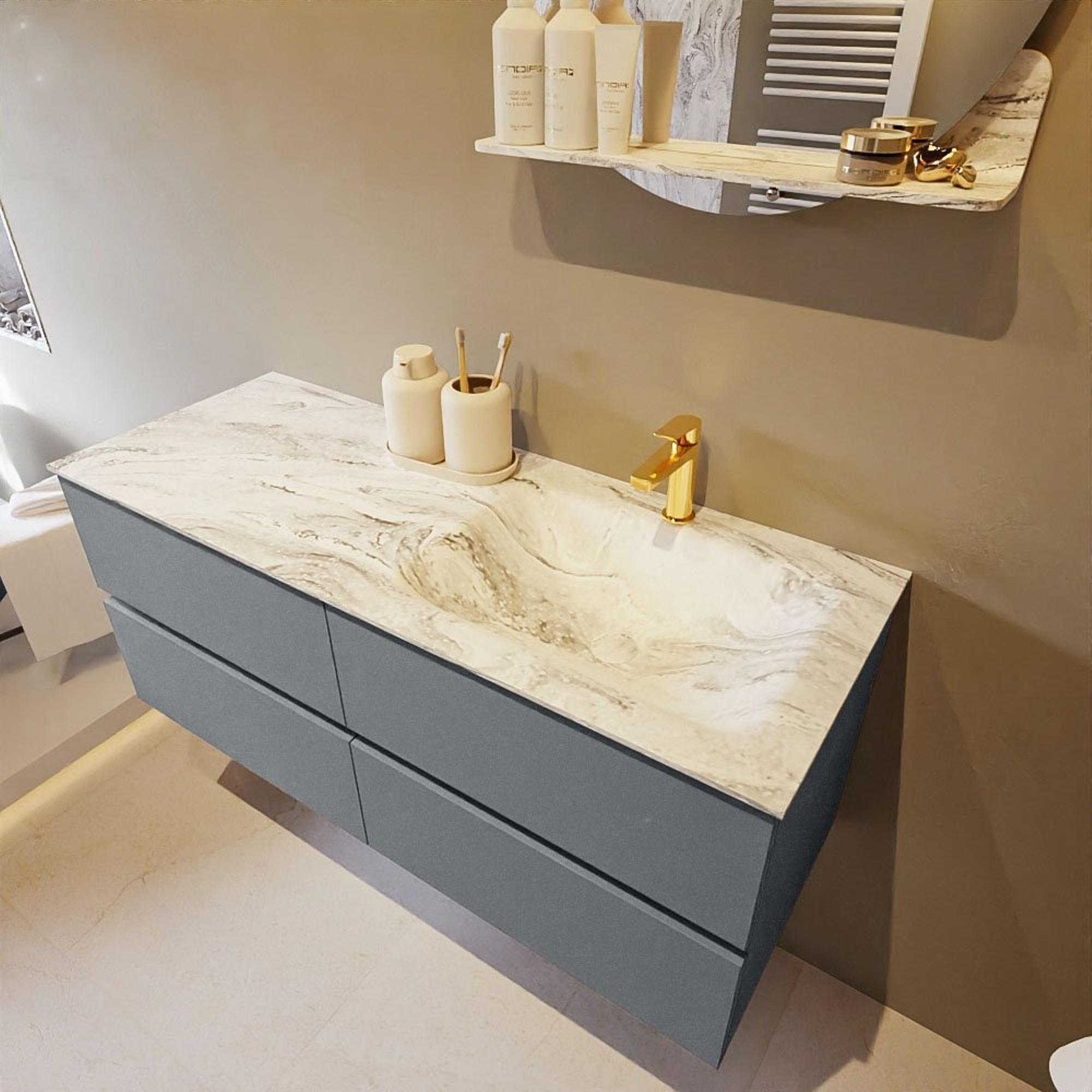 De buitengewone mooie badmeubel set VICA DLUX is een schitterend pronkstuk in uw badkamer. De gemarmerde Solid surface wastafel van CORIAN heeft een fraaie en tijdloze uitstraling. Door de zachte en natuurlijke vorm van de wastafel, gecombineerd met de tijdloze en prachtige badmeubel onderkast past de VICA-DLUX goed bij de diverse stijlen badkamers. Om uw badkamer compleet te af te stijlen hebben wij ook de nissen en spiegelhouders in dezelfde kleur als de wastafel. Zoals de Mondiaz nissen en spiegel planchetten. De serie VICA DLUX bestaat uit de 2 of 4 laden onderkast VICA gecombineerd met een CORIAN Solid surface wastafel met marmer structuur. De Solid surface CORIAN wastafel is in 5 marmer looks verkrijgbaar. Met deze badkamermeubel set heeft u wel die mooie marmeren uitstraling maar tevens ook het gemak en de hygiëne van Solid surface. Let op: U ziet bij de XL (60cm) variant de afbeeldingen/video's van de standaard hoogte (50cm)