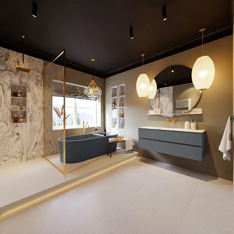 De buitengewone mooie badmeubel set VICA DLUX is een schitterend pronkstuk in uw badkamer. De gemarmerde Solid surface wastafel van CORIAN heeft een fraaie en tijdloze uitstraling. Door de zachte en natuurlijke vorm van de wastafel, gecombineerd met de tijdloze en prachtige badmeubel onderkast past de VICA-DLUX goed bij de diverse stijlen badkamers. Om uw badkamer compleet te af te stijlen hebben wij ook de nissen en spiegelhouders in dezelfde kleur als de wastafel. Zoals de Mondiaz nissen en spiegel planchetten. De serie VICA DLUX bestaat uit de 2 of 4 laden onderkast VICA gecombineerd met een CORIAN Solid surface wastafel met marmer structuur. De Solid surface CORIAN wastafel is in 5 marmer looks verkrijgbaar. Met deze badkamermeubel set heeft u wel die mooie marmeren uitstraling maar tevens ook het gemak en de hygiëne van Solid surface. Let op: U ziet bij de XL (60cm) variant de afbeeldingen/video's van de standaard hoogte (50cm)