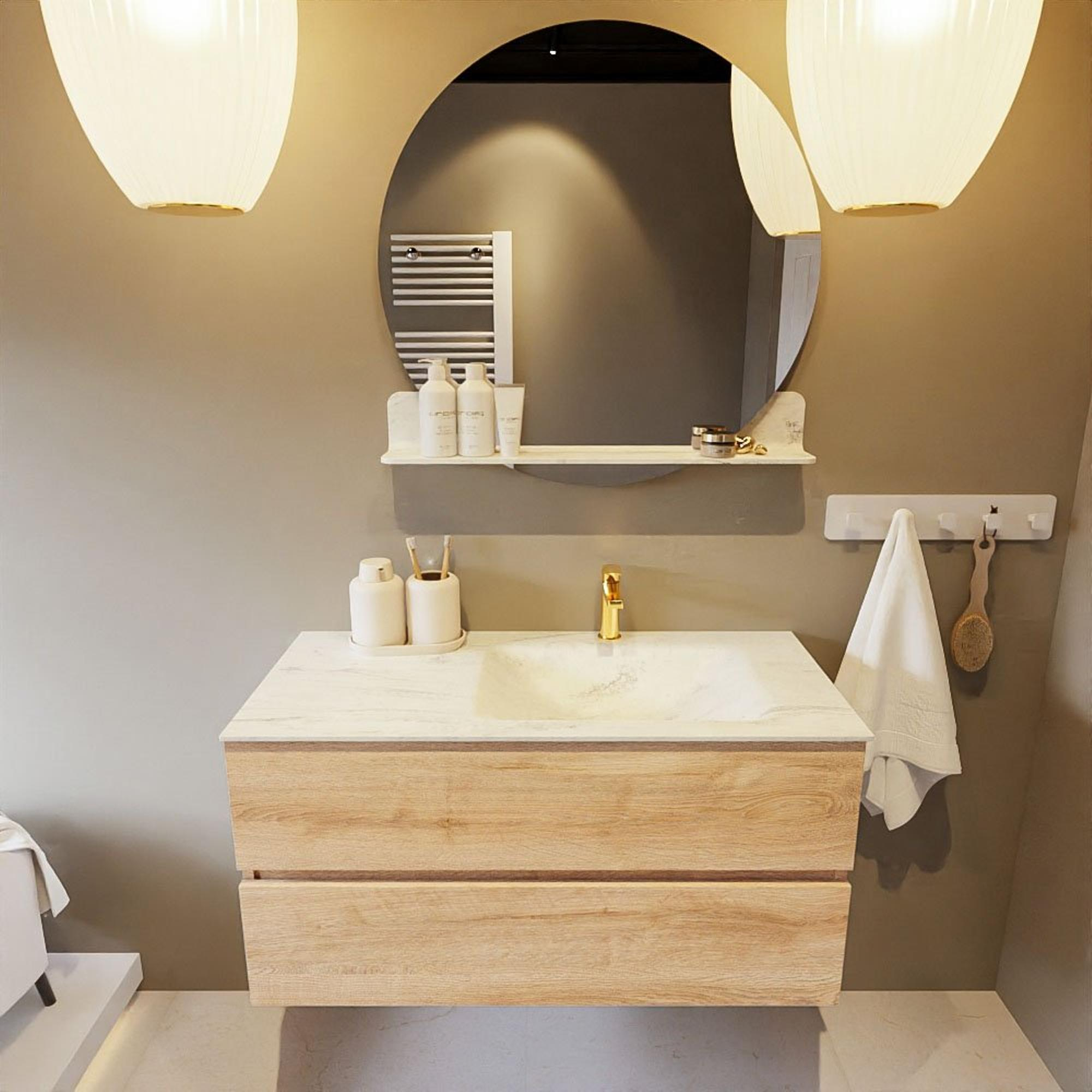 MONDIAZ VICA-DLUX Badkamermeubelset - 100cm - onderkast washed oak - 2 lades - inbouw wastafel cloud rechts - 1 kraangat - 60cm hoge versie - opalo