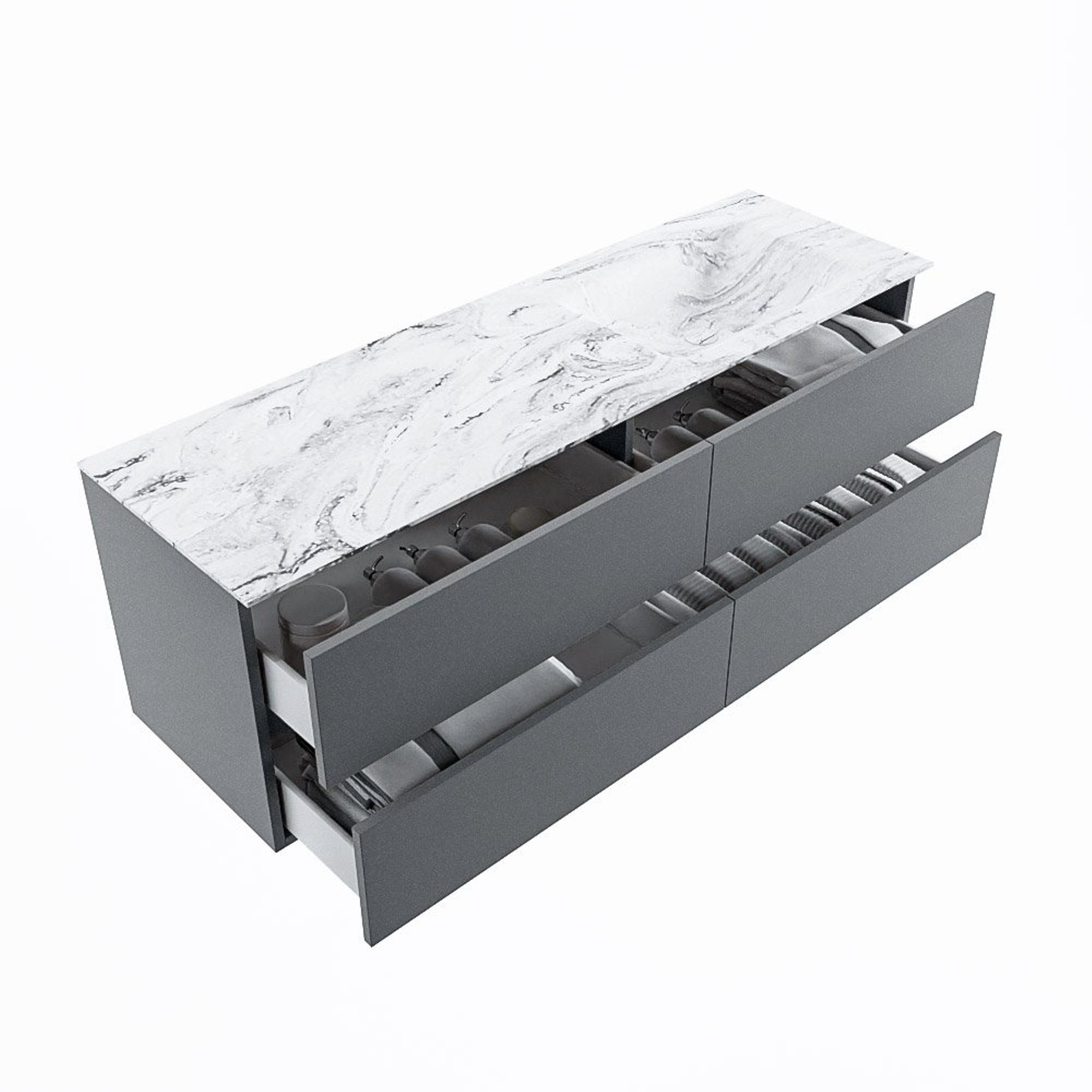 De buitengewone mooie badmeubel set VICA DLUX is een schitterend pronkstuk in uw badkamer. De gemarmerde Solid surface wastafel van CORIAN heeft een fraaie en tijdloze uitstraling. Door de zachte en natuurlijke vorm van de wastafel, gecombineerd met de tijdloze en prachtige badmeubel onderkast past de VICA-DLUX goed bij de diverse stijlen badkamers. Om uw badkamer compleet te af te stijlen hebben wij ook de nissen en spiegelhouders in dezelfde kleur als de wastafel. Zoals de Mondiaz nissen en spiegel planchetten. De serie VICA DLUX bestaat uit de 2 of 4 laden onderkast VICA gecombineerd met een CORIAN Solid surface wastafel met marmer structuur. De Solid surface CORIAN wastafel is in 5 marmer looks verkrijgbaar. Met deze badkamermeubel set heeft u wel die mooie marmeren uitstraling maar tevens ook het gemak en de hygiëne van Solid surface. Let op: U ziet bij de XL (60cm) variant de afbeeldingen/video's van de standaard hoogte (50cm)