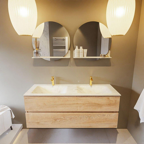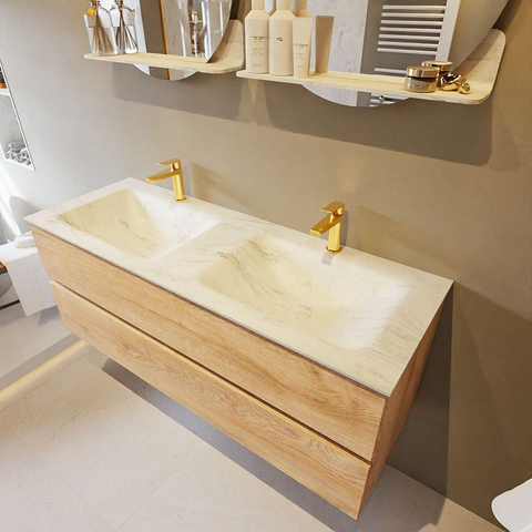 MONDIAZ VICA-DLUX Badkamermeubelset - 130cm - onderkast washed oak - 2 lades - inbouw wastafel cloud dubbel - 2 kraangaten - 60cm hoge versie - opalo
