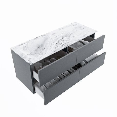 De buitengewone mooie badmeubel set VICA DLUX is een schitterend pronkstuk in uw badkamer. De gemarmerde Solid surface wastafel van CORIAN heeft een fraaie en tijdloze uitstraling. Door de zachte en natuurlijke vorm van de wastafel, gecombineerd met de tijdloze en prachtige badmeubel onderkast past de VICA-DLUX goed bij de diverse stijlen badkamers. Om uw badkamer compleet te af te stijlen hebben wij ook de nissen en spiegelhouders in dezelfde kleur als de wastafel. Zoals de Mondiaz nissen en spiegel planchetten. De serie VICA DLUX bestaat uit de 2 of 4 laden onderkast VICA gecombineerd met een CORIAN Solid surface wastafel met marmer structuur. De Solid surface CORIAN wastafel is in 5 marmer looks verkrijgbaar. Met deze badkamermeubel set heeft u wel die mooie marmeren uitstraling maar tevens ook het gemak en de hygiëne van Solid surface. Let op: U ziet bij de XL (60cm) variant de afbeeldingen/video's van de standaard hoogte (50cm)