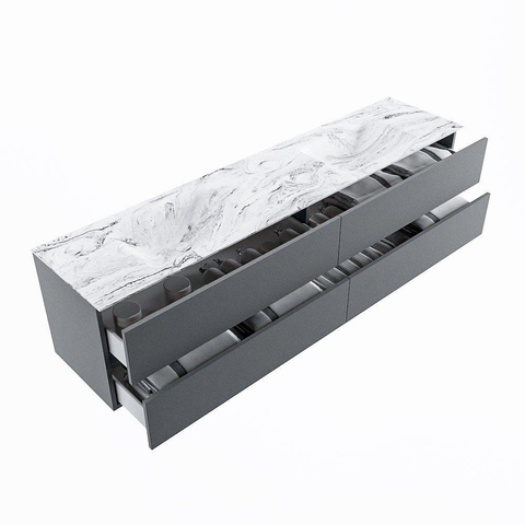 De buitengewone mooie badmeubel set VICA DLUX is een schitterend pronkstuk in uw badkamer. De gemarmerde Solid surface wastafel van CORIAN heeft een fraaie en tijdloze uitstraling. Door de zachte en natuurlijke vorm van de wastafel, gecombineerd met de tijdloze en prachtige badmeubel onderkast past de VICA-DLUX goed bij de diverse stijlen badkamers. Om uw badkamer compleet te af te stijlen hebben wij ook de nissen en spiegelhouders in dezelfde kleur als de wastafel. Zoals de Mondiaz nissen en spiegel planchetten. De serie VICA DLUX bestaat uit de 2 of 4 laden onderkast VICA gecombineerd met een CORIAN Solid surface wastafel met marmer structuur. De Solid surface CORIAN wastafel is in 5 marmer looks verkrijgbaar. Met deze badkamermeubel set heeft u wel die mooie marmeren uitstraling maar tevens ook het gemak en de hygiëne van Solid surface. Let op: U ziet bij de XL (60cm) variant de afbeeldingen/video's van de standaard hoogte (50cm)