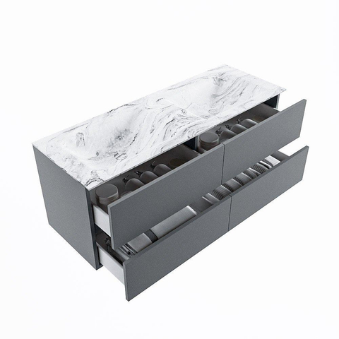 De buitengewone mooie badmeubel set VICA DLUX is een schitterend pronkstuk in uw badkamer. De gemarmerde Solid surface wastafel van CORIAN heeft een fraaie en tijdloze uitstraling. Door de zachte en natuurlijke vorm van de wastafel, gecombineerd met de tijdloze en prachtige badmeubel onderkast past de VICA-DLUX goed bij de diverse stijlen badkamers. Om uw badkamer compleet te af te stijlen hebben wij ook de nissen en spiegelhouders in dezelfde kleur als de wastafel. Zoals de Mondiaz nissen en spiegel planchetten. De serie VICA DLUX bestaat uit de 2 of 4 laden onderkast VICA gecombineerd met een CORIAN Solid surface wastafel met marmer structuur. De Solid surface CORIAN wastafel is in 5 marmer looks verkrijgbaar. Met deze badkamermeubel set heeft u wel die mooie marmeren uitstraling maar tevens ook het gemak en de hygiëne van Solid surface. Let op: U ziet bij de XL (60cm) variant de afbeeldingen/video's van de standaard hoogte (50cm)
