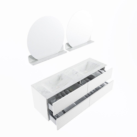 De buitengewone mooie badmeubel set VICA DLUX is een schitterend pronkstuk in uw badkamer. De gemarmerde Solid surface wastafel van CORIAN heeft een fraaie en tijdloze uitstraling. Door de zachte en natuurlijke vorm van de wastafel, gecombineerd met de tijdloze en prachtige badmeubel onderkast past de VICA-DLUX goed bij de diverse stijlen badkamers. Om uw badkamer compleet te af te stijlen hebben wij ook de nissen en spiegelhouders in dezelfde kleur als de wastafel. Zoals de Mondiaz nissen en spiegel planchetten. De serie VICA DLUX bestaat uit de 2 of 4 laden onderkast VICA gecombineerd met een CORIAN Solid surface wastafel met marmer structuur. De Solid surface CORIAN wastafel is in 5 marmer looks verkrijgbaar. Met deze badkamermeubel set heeft u wel die mooie marmeren uitstraling maar tevens ook het gemak en de hygiëne van Solid surface. Let op: U ziet bij de XL (60cm) variant de afbeeldingen/video's van de standaard hoogte (50cm)