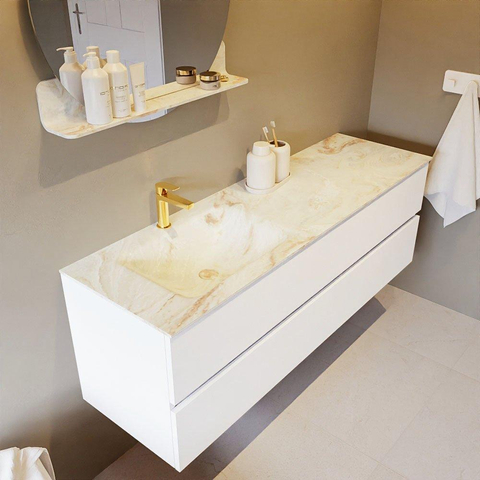 De buitengewone mooie badmeubel set VICA DLUX is een schitterend pronkstuk in uw badkamer. De gemarmerde Solid surface wastafel van CORIAN heeft een fraaie en tijdloze uitstraling. Door de zachte en natuurlijke vorm van de wastafel, gecombineerd met de tijdloze en prachtige badmeubel onderkast past de VICA-DLUX goed bij de diverse stijlen badkamers. Om uw badkamer compleet te af te stijlen hebben wij ook de nissen en spiegelhouders in dezelfde kleur als de wastafel. Zoals de Mondiaz nissen en spiegel planchetten. De serie VICA DLUX bestaat uit de 2 of 4 laden onderkast VICA gecombineerd met een CORIAN Solid surface wastafel met marmer structuur. De Solid surface CORIAN wastafel is in 5 marmer looks verkrijgbaar. Met deze badkamermeubel set heeft u wel die mooie marmeren uitstraling maar tevens ook het gemak en de hygiëne van Solid surface. Let op: U ziet bij de XL (60cm) variant de afbeeldingen/video's van de standaard hoogte (50cm)