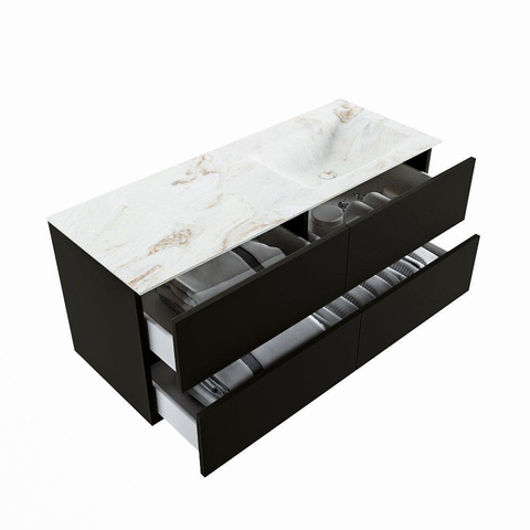 De buitengewone mooie badmeubel set VICA DLUX is een schitterend pronkstuk in uw badkamer. De gemarmerde Solid surface wastafel van CORIAN heeft een fraaie en tijdloze uitstraling. Door de zachte en natuurlijke vorm van de wastafel, gecombineerd met de tijdloze en prachtige badmeubel onderkast past de VICA-DLUX goed bij de diverse stijlen badkamers. Om uw badkamer compleet te af te stijlen hebben wij ook de nissen en spiegelhouders in dezelfde kleur als de wastafel. Zoals de Mondiaz nissen en spiegel planchetten. De serie VICA DLUX bestaat uit de 2 of 4 laden onderkast VICA gecombineerd met een CORIAN Solid surface wastafel met marmer structuur. De Solid surface CORIAN wastafel is in 5 marmer looks verkrijgbaar. Met deze badkamermeubel set heeft u wel die mooie marmeren uitstraling maar tevens ook het gemak en de hygiëne van Solid surface. Let op: U ziet bij de XL (60cm) variant de afbeeldingen/video's van de standaard hoogte (50cm)