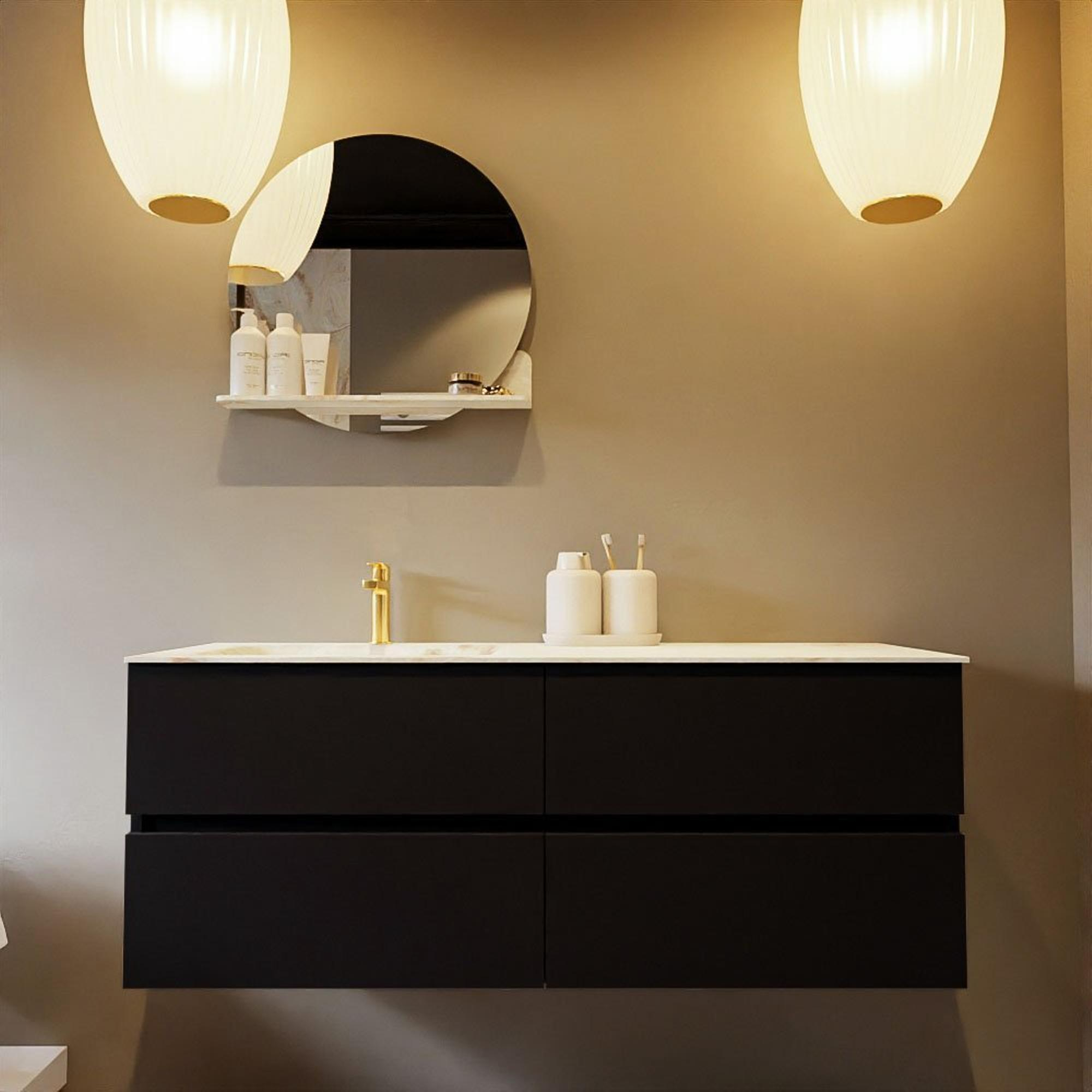 De buitengewone mooie badmeubel set VICA DLUX is een schitterend pronkstuk in uw badkamer. De gemarmerde Solid surface wastafel van CORIAN heeft een fraaie en tijdloze uitstraling. Door de zachte en natuurlijke vorm van de wastafel, gecombineerd met de tijdloze en prachtige badmeubel onderkast past de VICA-DLUX goed bij de diverse stijlen badkamers. Om uw badkamer compleet te af te stijlen hebben wij ook de nissen en spiegelhouders in dezelfde kleur als de wastafel. Zoals de Mondiaz nissen en spiegel planchetten. De serie VICA DLUX bestaat uit de 2 of 4 laden onderkast VICA gecombineerd met een CORIAN Solid surface wastafel met marmer structuur. De Solid surface CORIAN wastafel is in 5 marmer looks verkrijgbaar. Met deze badkamermeubel set heeft u wel die mooie marmeren uitstraling maar tevens ook het gemak en de hygiëne van Solid surface. Let op: U ziet bij de XL (60cm) variant de afbeeldingen/video's van de standaard hoogte (50cm)