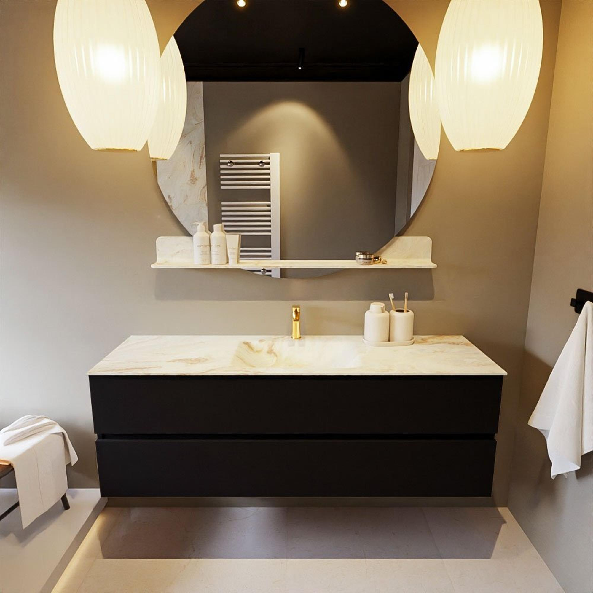De buitengewone mooie badmeubel set VICA DLUX is een schitterend pronkstuk in uw badkamer. De gemarmerde Solid surface wastafel van CORIAN heeft een fraaie en tijdloze uitstraling. Door de zachte en natuurlijke vorm van de wastafel, gecombineerd met de tijdloze en prachtige badmeubel onderkast past de VICA-DLUX goed bij de diverse stijlen badkamers. Om uw badkamer compleet te af te stijlen hebben wij ook de nissen en spiegelhouders in dezelfde kleur als de wastafel. Zoals de Mondiaz nissen en spiegel planchetten. De serie VICA DLUX bestaat uit de 2 of 4 laden onderkast VICA gecombineerd met een CORIAN Solid surface wastafel met marmer structuur. De Solid surface CORIAN wastafel is in 5 marmer looks verkrijgbaar. Met deze badkamermeubel set heeft u wel die mooie marmeren uitstraling maar tevens ook het gemak en de hygiëne van Solid surface. Let op: U ziet bij de XL (60cm) variant de afbeeldingen/video's van de standaard hoogte (50cm)