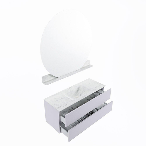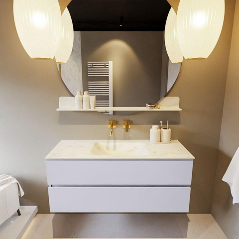 De buitengewone mooie badmeubel set VICA DLUX is een schitterend pronkstuk in uw badkamer. De gemarmerde Solid surface wastafel van CORIAN heeft een fraaie en tijdloze uitstraling. Door de zachte en natuurlijke vorm van de wastafel, gecombineerd met de tijdloze en prachtige badmeubel onderkast past de VICA-DLUX goed bij de diverse stijlen badkamers. Om uw badkamer compleet te af te stijlen hebben wij ook de nissen en spiegelhouders in dezelfde kleur als de wastafel. Zoals de Mondiaz nissen en spiegel planchetten. De serie VICA DLUX bestaat uit de 2 of 4 laden onderkast VICA gecombineerd met een CORIAN Solid surface wastafel met marmer structuur. De Solid surface CORIAN wastafel is in 5 marmer looks verkrijgbaar. Met deze badkamermeubel set heeft u wel die mooie marmeren uitstraling maar tevens ook het gemak en de hygiëne van Solid surface. Let op: U ziet bij de XL (60cm) variant de afbeeldingen/video's van de standaard hoogte (50cm)