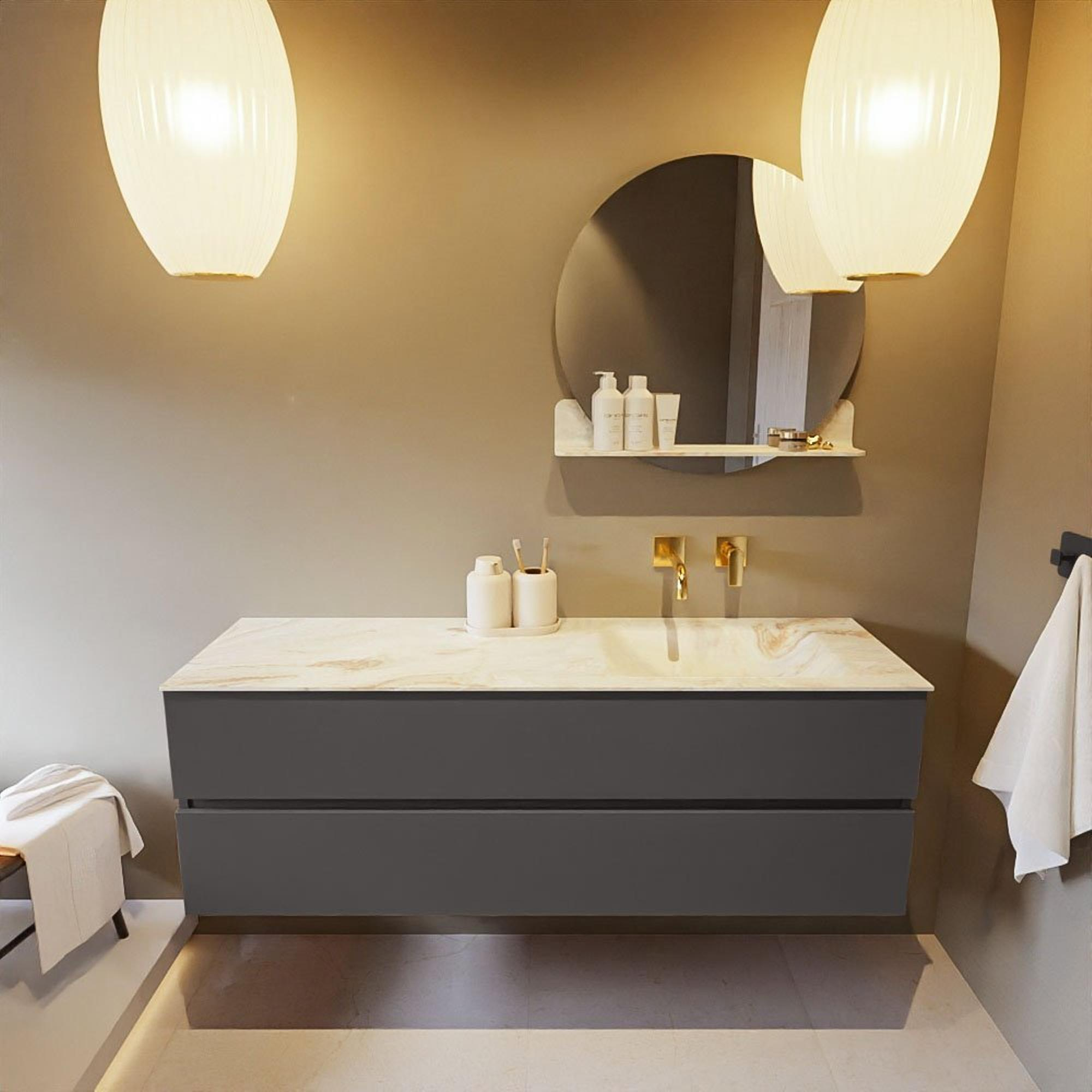 De buitengewone mooie badmeubel set VICA DLUX is een schitterend pronkstuk in uw badkamer. De gemarmerde Solid surface wastafel van CORIAN heeft een fraaie en tijdloze uitstraling. Door de zachte en natuurlijke vorm van de wastafel, gecombineerd met de tijdloze en prachtige badmeubel onderkast past de VICA-DLUX goed bij de diverse stijlen badkamers. Om uw badkamer compleet te af te stijlen hebben wij ook de nissen en spiegelhouders in dezelfde kleur als de wastafel. Zoals de Mondiaz nissen en spiegel planchetten. De serie VICA DLUX bestaat uit de 2 of 4 laden onderkast VICA gecombineerd met een CORIAN Solid surface wastafel met marmer structuur. De Solid surface CORIAN wastafel is in 5 marmer looks verkrijgbaar. Met deze badkamermeubel set heeft u wel die mooie marmeren uitstraling maar tevens ook het gemak en de hygiëne van Solid surface. Let op: U ziet bij de XL (60cm) variant de afbeeldingen/video's van de standaard hoogte (50cm)