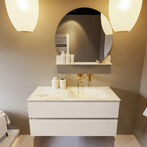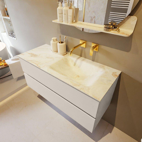 De buitengewone mooie badmeubel set VICA DLUX is een schitterend pronkstuk in uw badkamer. De gemarmerde Solid surface wastafel van CORIAN heeft een fraaie en tijdloze uitstraling. Door de zachte en natuurlijke vorm van de wastafel, gecombineerd met de tijdloze en prachtige badmeubel onderkast past de VICA-DLUX goed bij de diverse stijlen badkamers. Om uw badkamer compleet te af te stijlen hebben wij ook de nissen en spiegelhouders in dezelfde kleur als de wastafel. Zoals de Mondiaz nissen en spiegel planchetten. De serie VICA DLUX bestaat uit de 2 of 4 laden onderkast VICA gecombineerd met een CORIAN Solid surface wastafel met marmer structuur. De Solid surface CORIAN wastafel is in 5 marmer looks verkrijgbaar. Met deze badkamermeubel set heeft u wel die mooie marmeren uitstraling maar tevens ook het gemak en de hygiëne van Solid surface. Let op: U ziet bij de XL (60cm) variant de afbeeldingen/video's van de standaard hoogte (50cm)