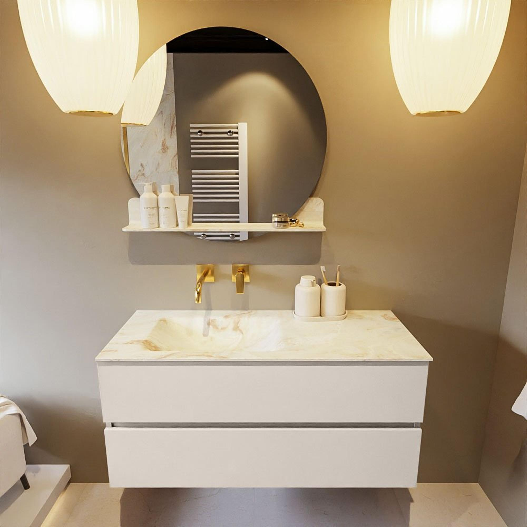 De buitengewone mooie badmeubel set VICA DLUX is een schitterend pronkstuk in uw badkamer. De gemarmerde Solid surface wastafel van CORIAN heeft een fraaie en tijdloze uitstraling. Door de zachte en natuurlijke vorm van de wastafel, gecombineerd met de tijdloze en prachtige badmeubel onderkast past de VICA-DLUX goed bij de diverse stijlen badkamers. Om uw badkamer compleet te af te stijlen hebben wij ook de nissen en spiegelhouders in dezelfde kleur als de wastafel. Zoals de Mondiaz nissen en spiegel planchetten. De serie VICA DLUX bestaat uit de 2 of 4 laden onderkast VICA gecombineerd met een CORIAN Solid surface wastafel met marmer structuur. De Solid surface CORIAN wastafel is in 5 marmer looks verkrijgbaar. Met deze badkamermeubel set heeft u wel die mooie marmeren uitstraling maar tevens ook het gemak en de hygiëne van Solid surface. Let op: U ziet bij de XL (60cm) variant de afbeeldingen/video's van de standaard hoogte (50cm)