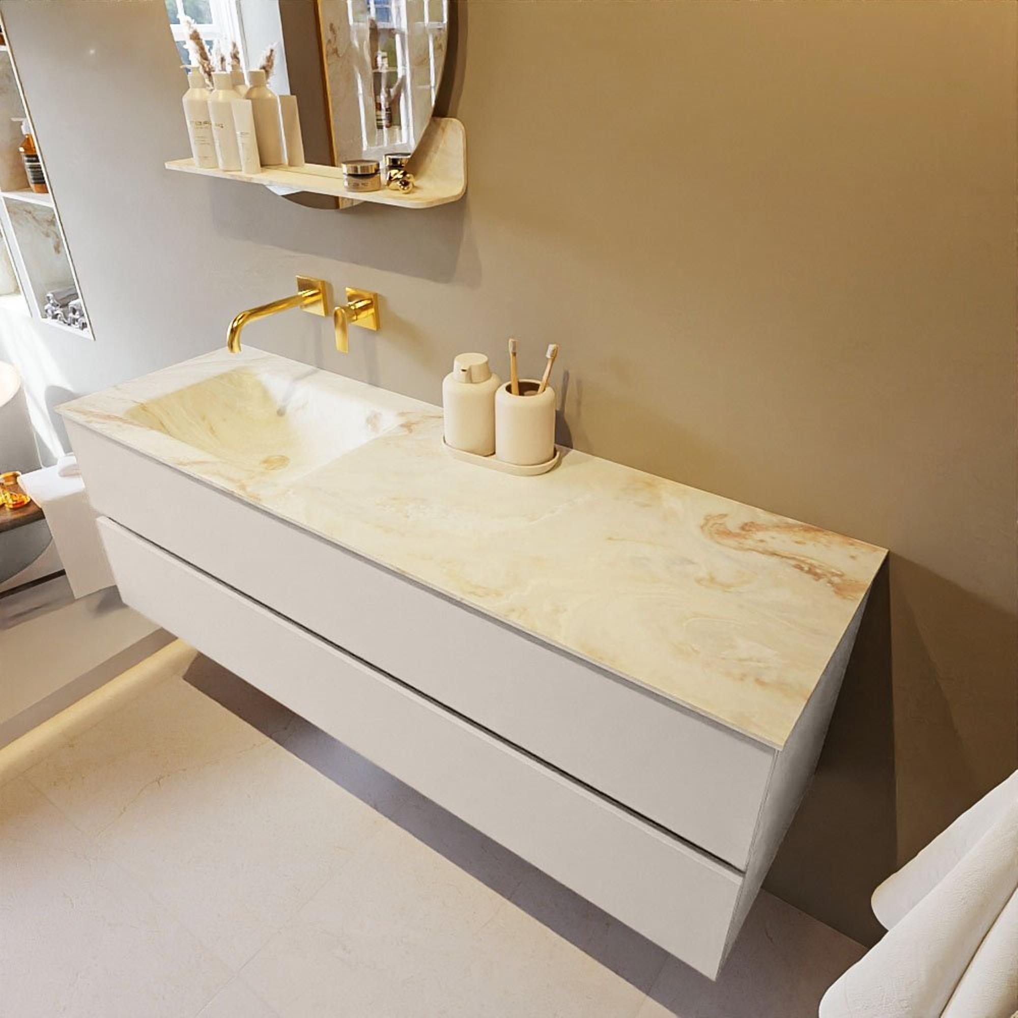 De buitengewone mooie badmeubel set VICA DLUX is een schitterend pronkstuk in uw badkamer. De gemarmerde Solid surface wastafel van CORIAN heeft een fraaie en tijdloze uitstraling. Door de zachte en natuurlijke vorm van de wastafel, gecombineerd met de tijdloze en prachtige badmeubel onderkast past de VICA-DLUX goed bij de diverse stijlen badkamers. Om uw badkamer compleet te af te stijlen hebben wij ook de nissen en spiegelhouders in dezelfde kleur als de wastafel. Zoals de Mondiaz nissen en spiegel planchetten. De serie VICA DLUX bestaat uit de 2 of 4 laden onderkast VICA gecombineerd met een CORIAN Solid surface wastafel met marmer structuur. De Solid surface CORIAN wastafel is in 5 marmer looks verkrijgbaar. Met deze badkamermeubel set heeft u wel die mooie marmeren uitstraling maar tevens ook het gemak en de hygiëne van Solid surface. Let op: U ziet bij de XL (60cm) variant de afbeeldingen/video's van de standaard hoogte (50cm)