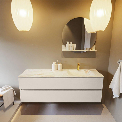 De buitengewone mooie badmeubel set VICA DLUX is een schitterend pronkstuk in uw badkamer. De gemarmerde Solid surface wastafel van CORIAN heeft een fraaie en tijdloze uitstraling. Door de zachte en natuurlijke vorm van de wastafel, gecombineerd met de tijdloze en prachtige badmeubel onderkast past de VICA-DLUX goed bij de diverse stijlen badkamers. Om uw badkamer compleet te af te stijlen hebben wij ook de nissen en spiegelhouders in dezelfde kleur als de wastafel. Zoals de Mondiaz nissen en spiegel planchetten. De serie VICA DLUX bestaat uit de 2 of 4 laden onderkast VICA gecombineerd met een CORIAN Solid surface wastafel met marmer structuur. De Solid surface CORIAN wastafel is in 5 marmer looks verkrijgbaar. Met deze badkamermeubel set heeft u wel die mooie marmeren uitstraling maar tevens ook het gemak en de hygiëne van Solid surface. Let op: U ziet bij de XL (60cm) variant de afbeeldingen/video's van de standaard hoogte (50cm)