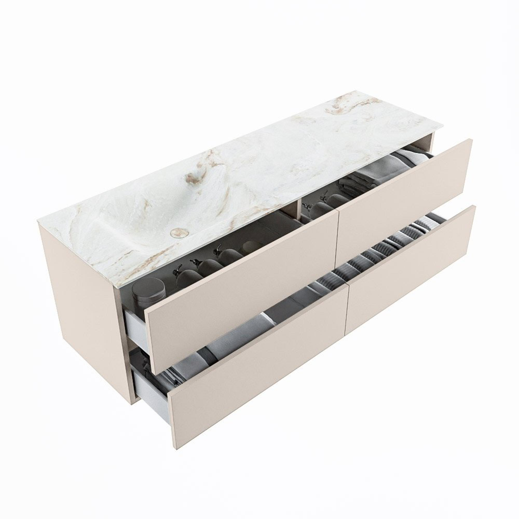 MONDIAZ VICA-DLUX Badkamermeubelset - 150cm - onderkast linen - 4 lades - inbouw wastafel cloud links - 1 kraangat - 60cm hoge versie - frape