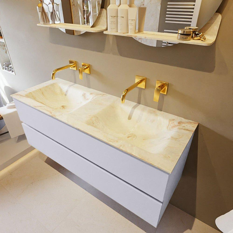 De buitengewone mooie badmeubel set VICA DLUX is een schitterend pronkstuk in uw badkamer. De gemarmerde Solid surface wastafel van CORIAN heeft een fraaie en tijdloze uitstraling. Door de zachte en natuurlijke vorm van de wastafel, gecombineerd met de tijdloze en prachtige badmeubel onderkast past de VICA-DLUX goed bij de diverse stijlen badkamers. Om uw badkamer compleet te af te stijlen hebben wij ook de nissen en spiegelhouders in dezelfde kleur als de wastafel. Zoals de Mondiaz nissen en spiegel planchetten. De serie VICA DLUX bestaat uit de 2 of 4 laden onderkast VICA gecombineerd met een CORIAN Solid surface wastafel met marmer structuur. De Solid surface CORIAN wastafel is in 5 marmer looks verkrijgbaar. Met deze badkamermeubel set heeft u wel die mooie marmeren uitstraling maar tevens ook het gemak en de hygiëne van Solid surface. Let op: U ziet bij de XL (60cm) variant de afbeeldingen/video's van de standaard hoogte (50cm)
