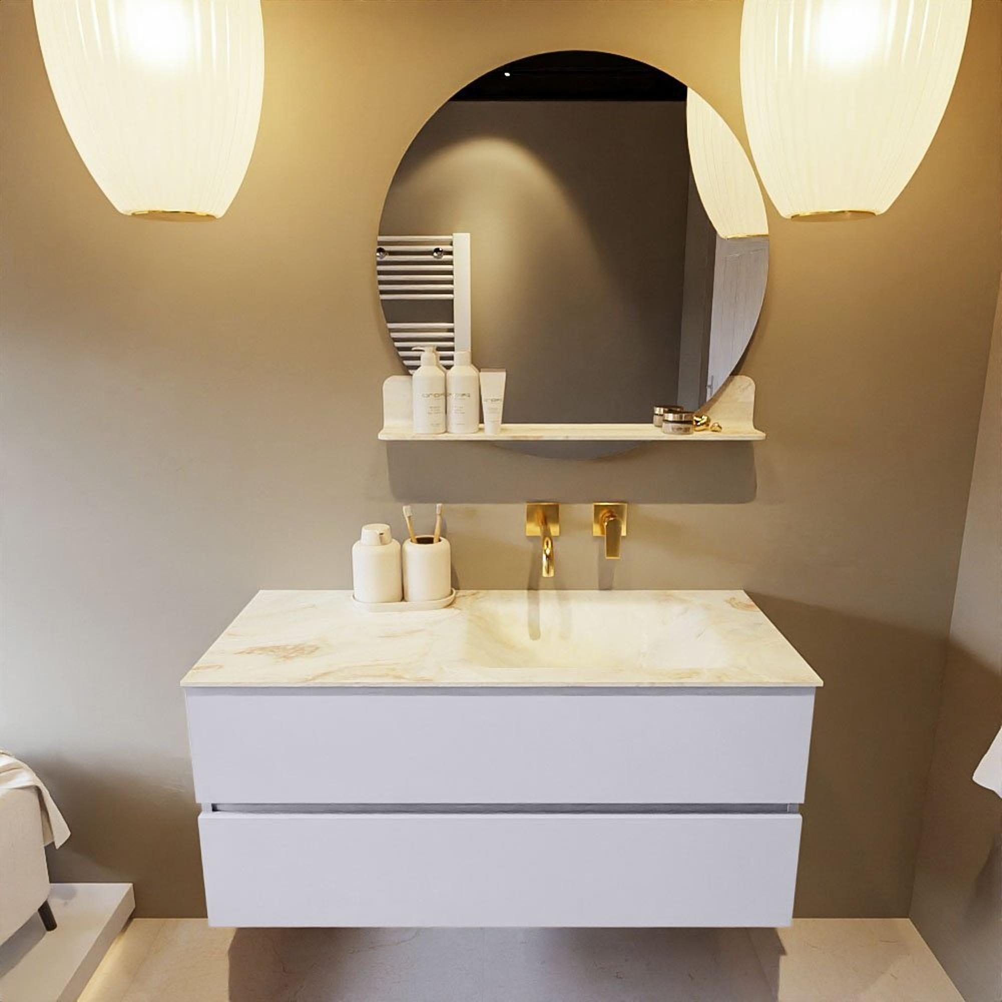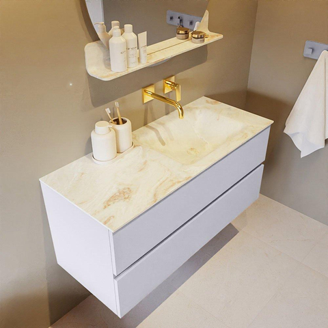 De buitengewone mooie badmeubel set VICA DLUX is een schitterend pronkstuk in uw badkamer. De gemarmerde Solid surface wastafel van CORIAN heeft een fraaie en tijdloze uitstraling. Door de zachte en natuurlijke vorm van de wastafel, gecombineerd met de tijdloze en prachtige badmeubel onderkast past de VICA-DLUX goed bij de diverse stijlen badkamers. Om uw badkamer compleet te af te stijlen hebben wij ook de nissen en spiegelhouders in dezelfde kleur als de wastafel. Zoals de Mondiaz nissen en spiegel planchetten. De serie VICA DLUX bestaat uit de 2 of 4 laden onderkast VICA gecombineerd met een CORIAN Solid surface wastafel met marmer structuur. De Solid surface CORIAN wastafel is in 5 marmer looks verkrijgbaar. Met deze badkamermeubel set heeft u wel die mooie marmeren uitstraling maar tevens ook het gemak en de hygiëne van Solid surface. Let op: U ziet bij de XL (60cm) variant de afbeeldingen/video's van de standaard hoogte (50cm)