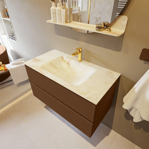 De buitengewone mooie badmeubel set VICA DLUX is een schitterend pronkstuk in uw badkamer. De gemarmerde Solid surface wastafel van CORIAN heeft een fraaie en tijdloze uitstraling. Door de zachte en natuurlijke vorm van de wastafel, gecombineerd met de tijdloze en prachtige badmeubel onderkast past de VICA-DLUX goed bij de diverse stijlen badkamers. Om uw badkamer compleet te af te stijlen hebben wij ook de nissen en spiegelhouders in dezelfde kleur als de wastafel. Zoals de Mondiaz nissen en spiegel planchetten. De serie VICA DLUX bestaat uit de 2 of 4 laden onderkast VICA gecombineerd met een CORIAN Solid surface wastafel met marmer structuur. De Solid surface CORIAN wastafel is in 5 marmer looks verkrijgbaar. Met deze badkamermeubel set heeft u wel die mooie marmeren uitstraling maar tevens ook het gemak en de hygiëne van Solid surface. Let op: U ziet bij de XL (60cm) variant de afbeeldingen/video's van de standaard hoogte (50cm)