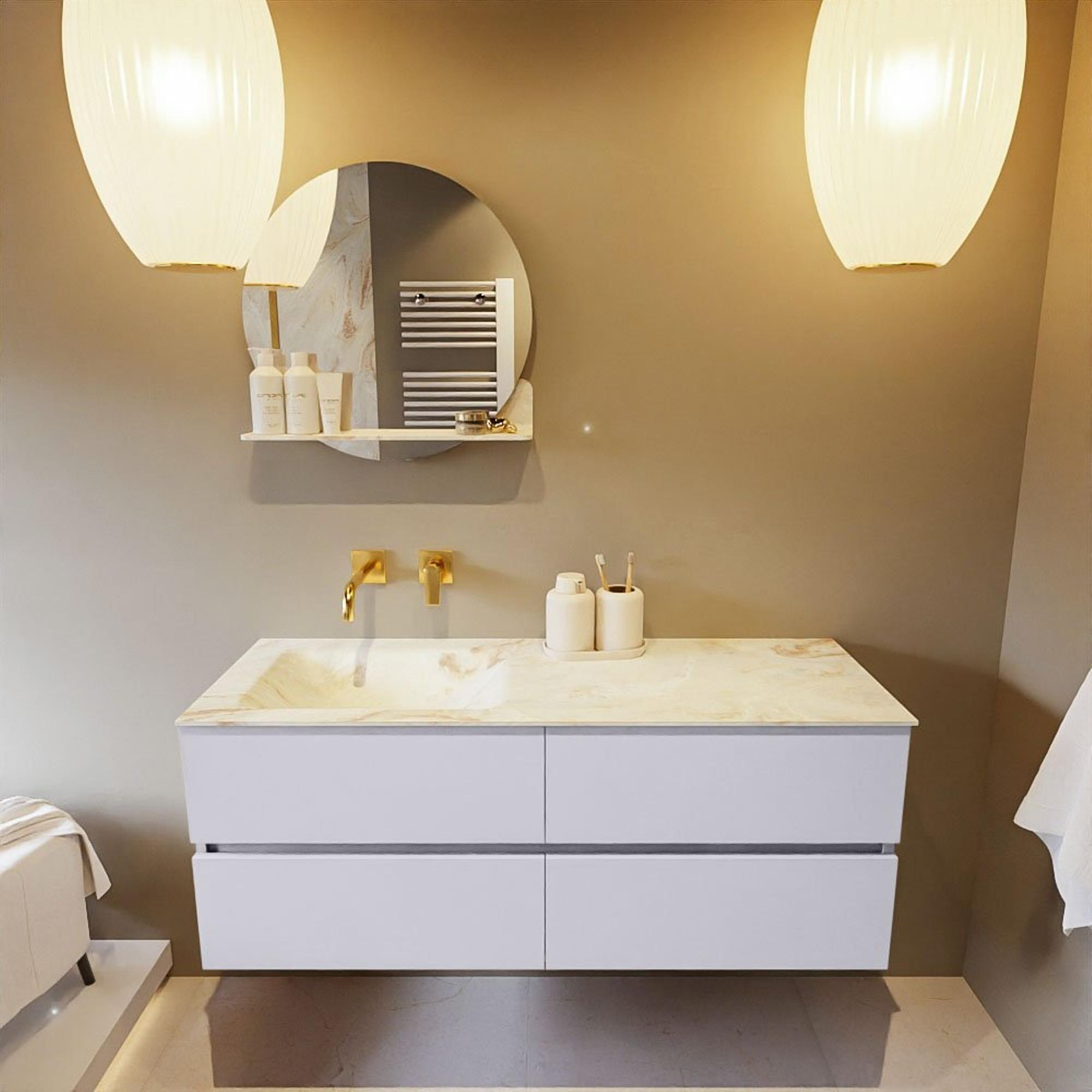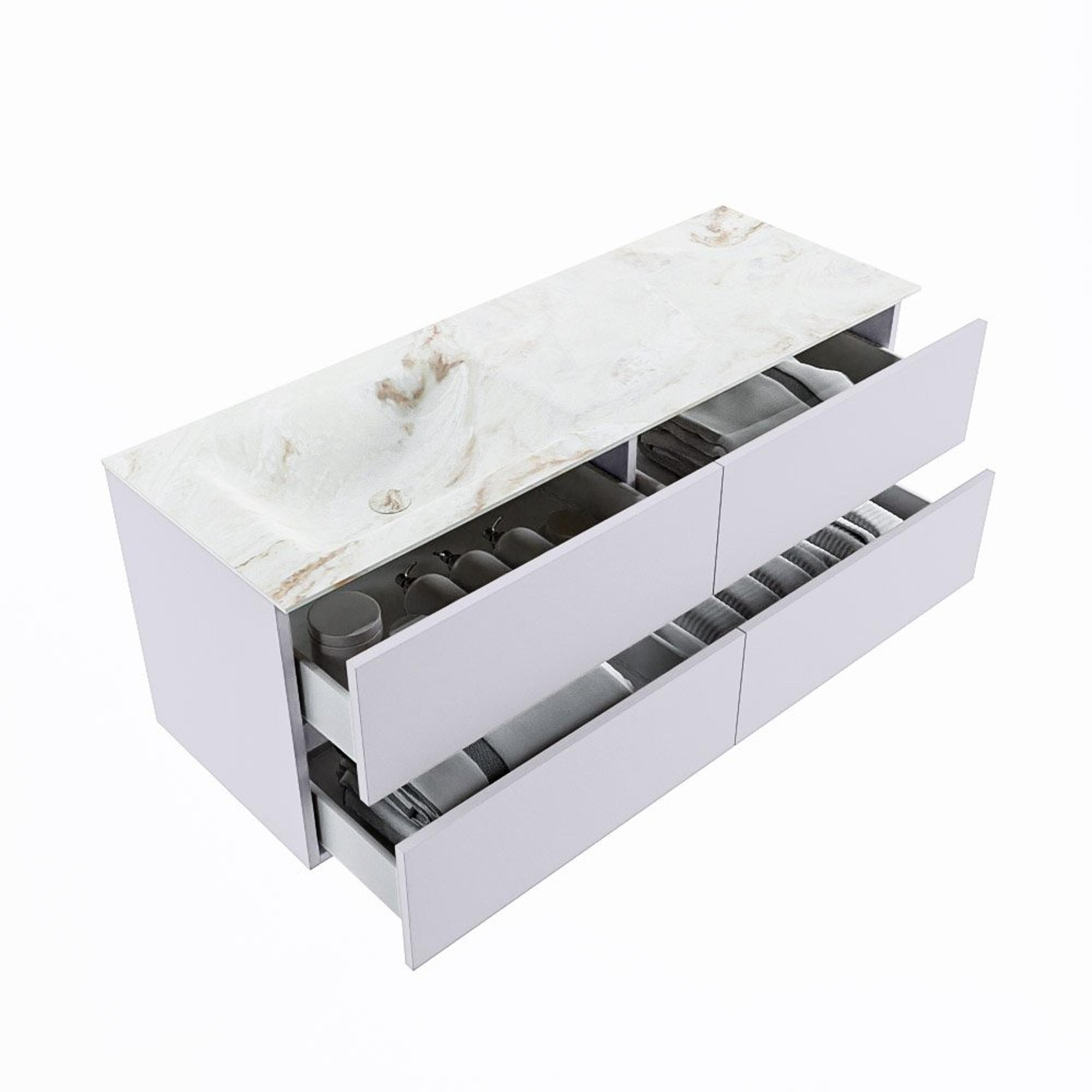 De buitengewone mooie badmeubel set VICA DLUX is een schitterend pronkstuk in uw badkamer. De gemarmerde Solid surface wastafel van CORIAN heeft een fraaie en tijdloze uitstraling. Door de zachte en natuurlijke vorm van de wastafel, gecombineerd met de tijdloze en prachtige badmeubel onderkast past de VICA-DLUX goed bij de diverse stijlen badkamers. Om uw badkamer compleet te af te stijlen hebben wij ook de nissen en spiegelhouders in dezelfde kleur als de wastafel. Zoals de Mondiaz nissen en spiegel planchetten. De serie VICA DLUX bestaat uit de 2 of 4 laden onderkast VICA gecombineerd met een CORIAN Solid surface wastafel met marmer structuur. De Solid surface CORIAN wastafel is in 5 marmer looks verkrijgbaar. Met deze badkamermeubel set heeft u wel die mooie marmeren uitstraling maar tevens ook het gemak en de hygiëne van Solid surface. Let op: U ziet bij de XL (60cm) variant de afbeeldingen/video's van de standaard hoogte (50cm)