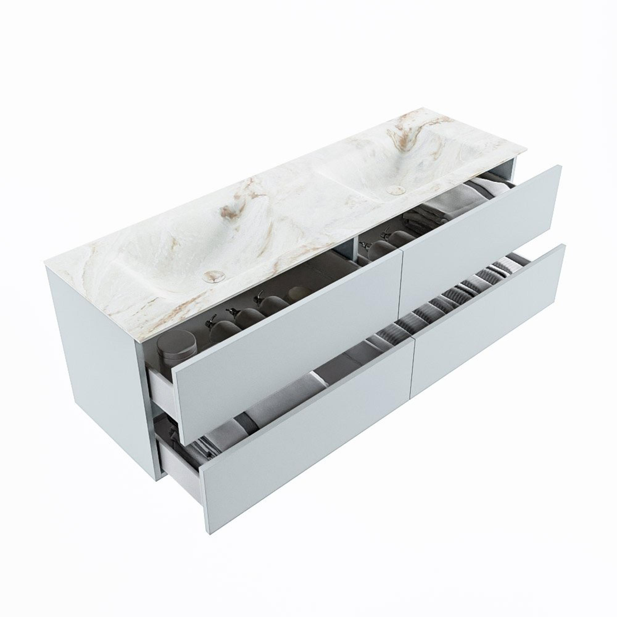De buitengewone mooie badmeubel set VICA DLUX is een schitterend pronkstuk in uw badkamer. De gemarmerde Solid surface wastafel van CORIAN heeft een fraaie en tijdloze uitstraling. Door de zachte en natuurlijke vorm van de wastafel, gecombineerd met de tijdloze en prachtige badmeubel onderkast past de VICA-DLUX goed bij de diverse stijlen badkamers. Om uw badkamer compleet te af te stijlen hebben wij ook de nissen en spiegelhouders in dezelfde kleur als de wastafel. Zoals de Mondiaz nissen en spiegel planchetten. De serie VICA DLUX bestaat uit de 2 of 4 laden onderkast VICA gecombineerd met een CORIAN Solid surface wastafel met marmer structuur. De Solid surface CORIAN wastafel is in 5 marmer looks verkrijgbaar. Met deze badkamermeubel set heeft u wel die mooie marmeren uitstraling maar tevens ook het gemak en de hygiëne van Solid surface. Let op: U ziet bij de XL (60cm) variant de afbeeldingen/video's van de standaard hoogte (50cm)