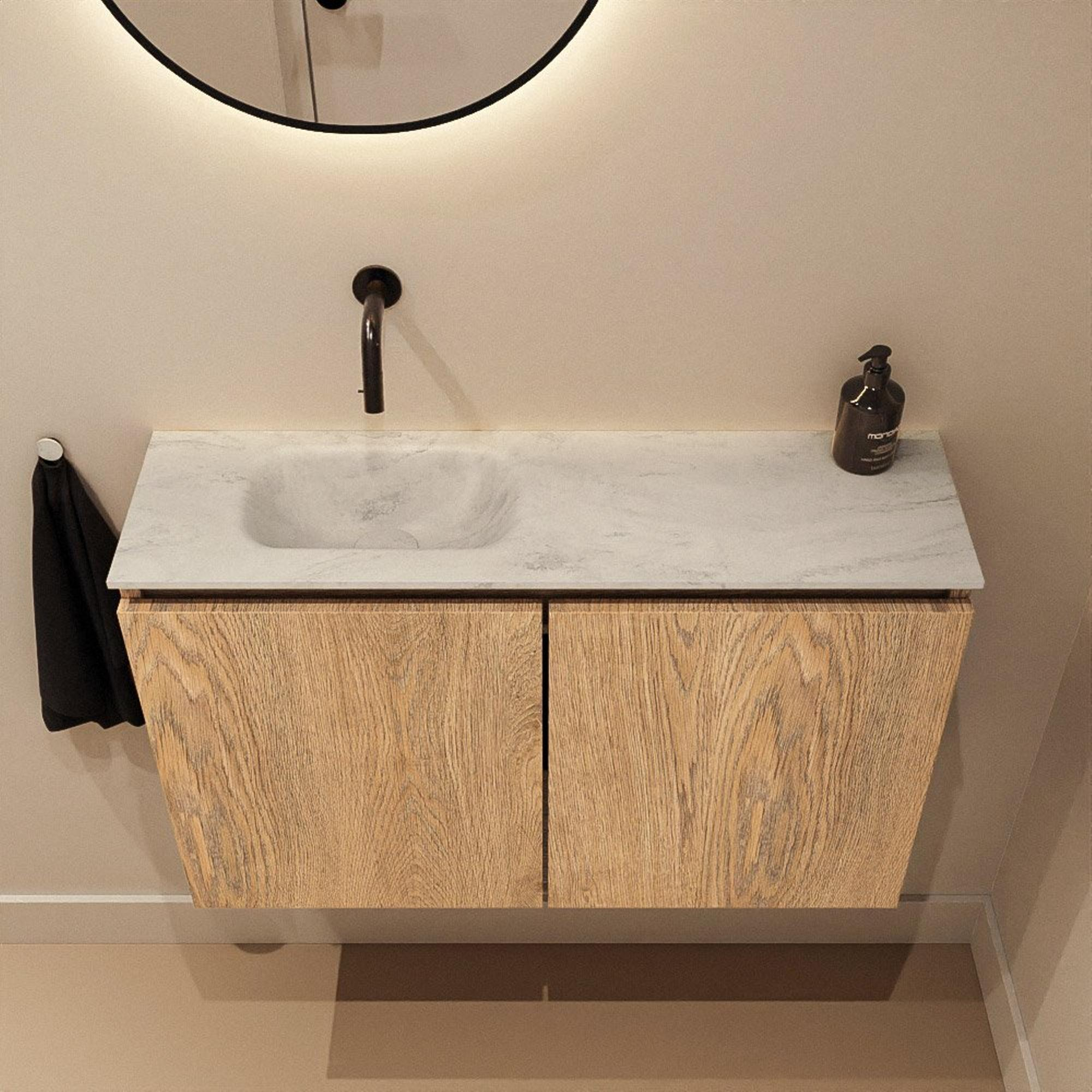 MONDIAZ TURE-DLUX 80cm toiletmeubel Washed Oak. EDEN wastafel Opalo positie links. Zonder kraangat.