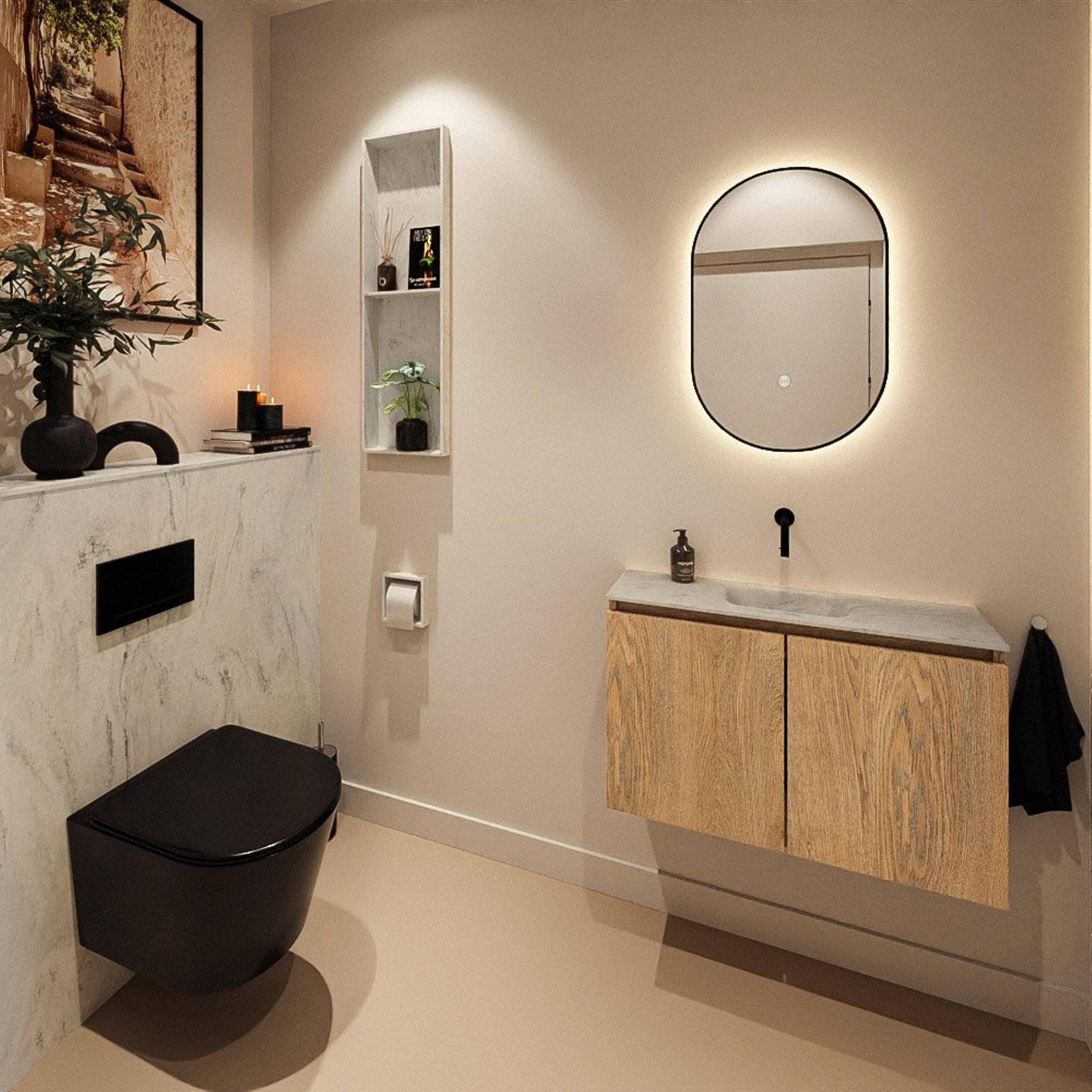 MONDIAZ TURE-DLUX 80cm toiletmeubel Washed Oak. EDEN wastafel Opalo positie midden. Zonder kraangat.