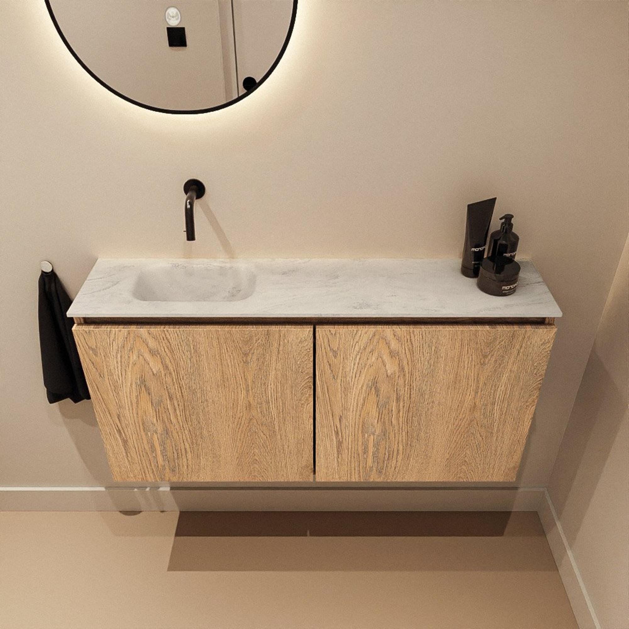 MONDIAZ TURE-DLUX 100cm toiletmeubel Washed Oak. EDEN wastafel Opalo positie links. Zonder kraangat.