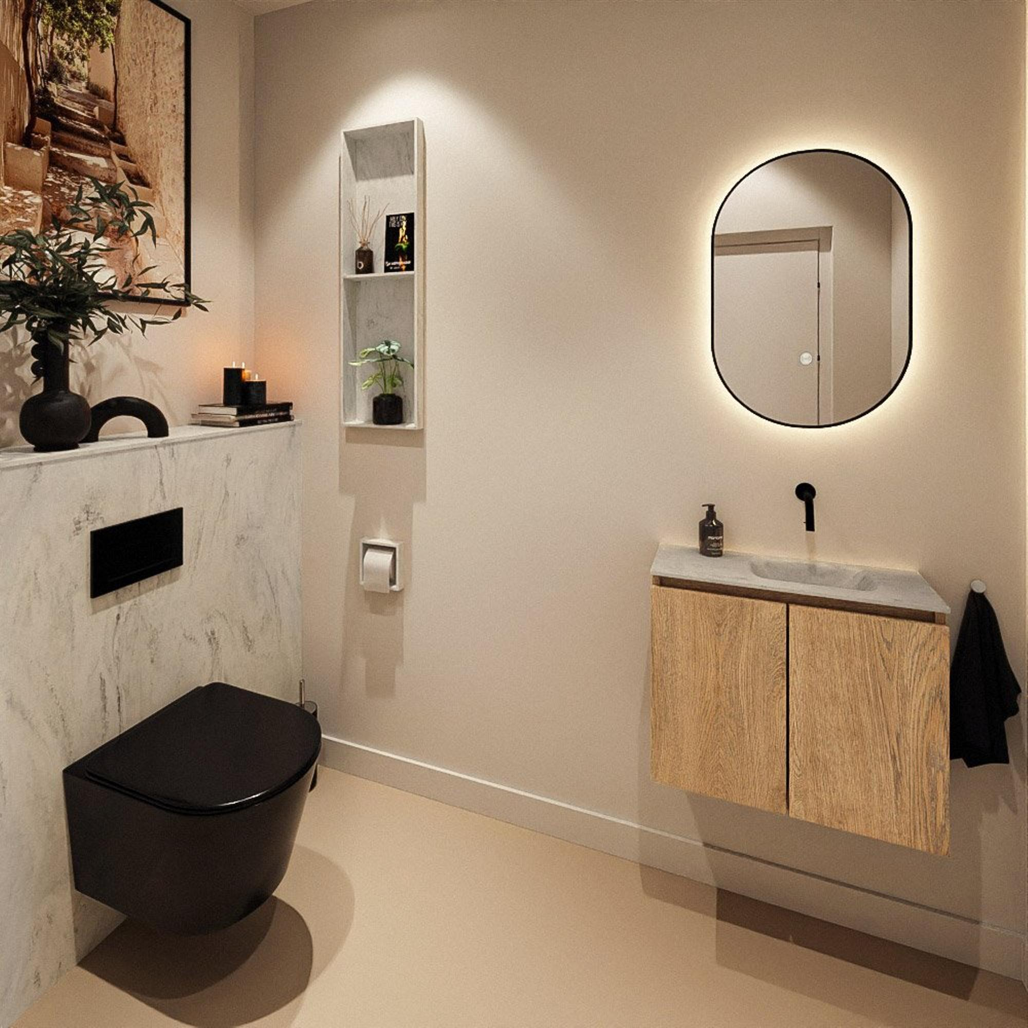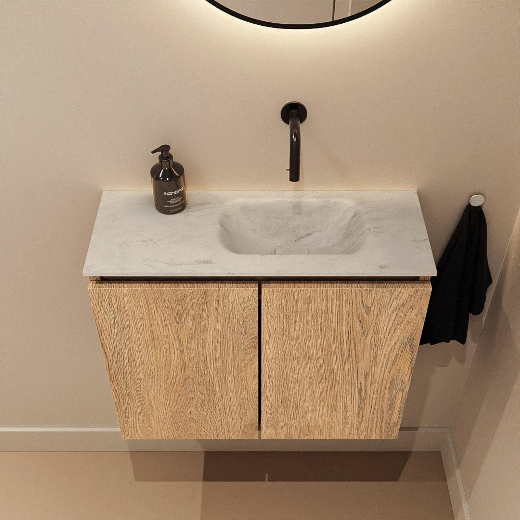 MONDIAZ TURE-DLUX 60cm toiletmeubel Washed Oak. EDEN wastafel Opalo positie rechts. Zonder kraangat.
