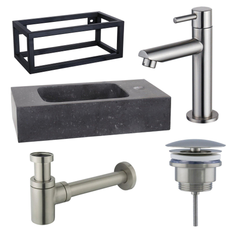 Fortifura Fuente fonteinset - 40x22x24.5cm - 1 kraangat - natuursteen - zwart frame - fonteinkraan RVS geborsteld - zwart