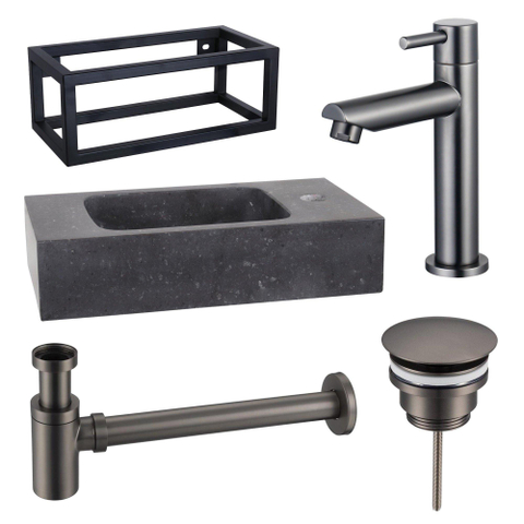 Fortifura Fuente fonteinset - 40x22x24.5cm - 1 kraangat - natuursteen - zwart frame - fonteinkraan gunmetal - zwart