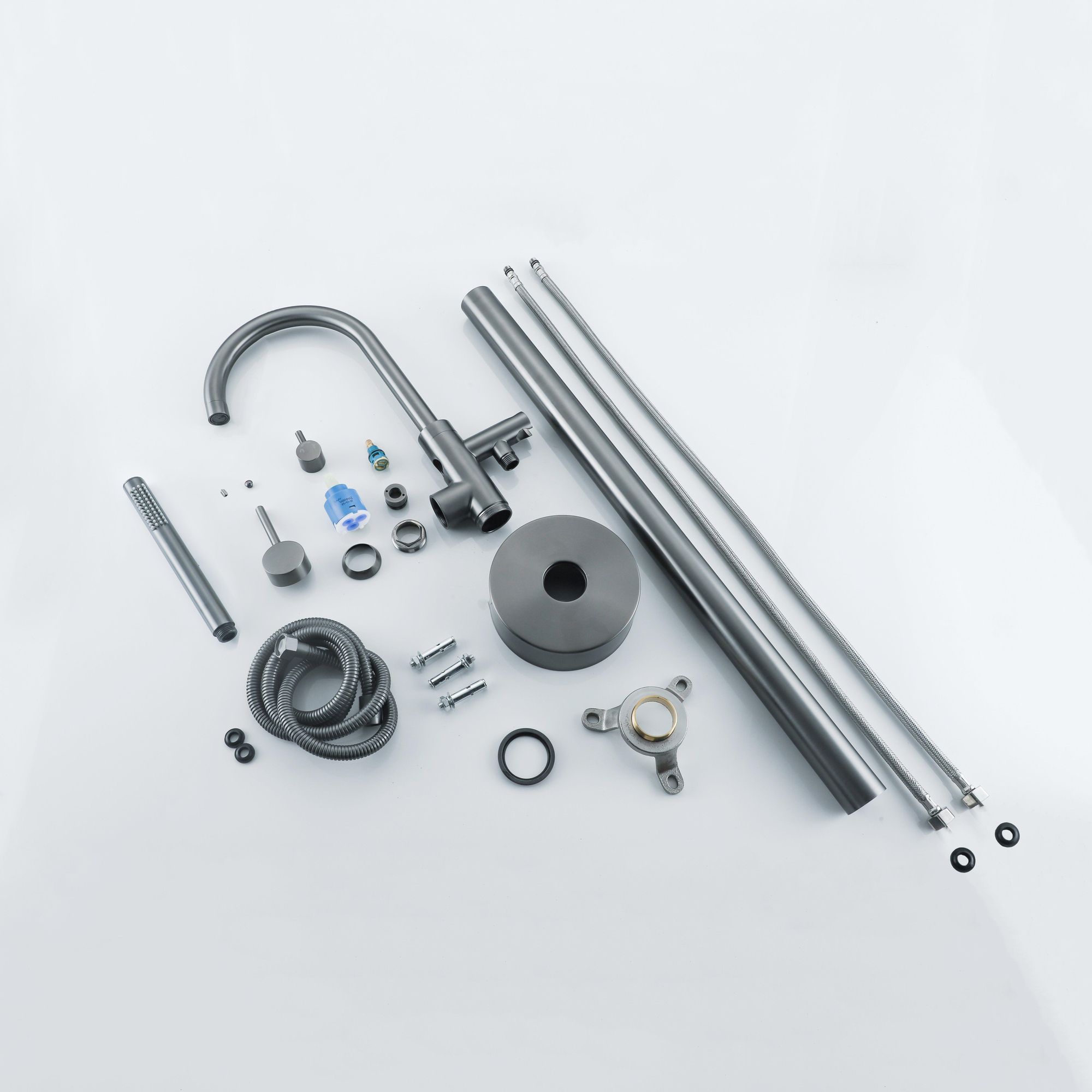 Stoer gunmetalGunmetal sanitair wordt steeds populairder. De stoere, bijna mat zwarte look, geeft de ruimte direct een stoere en luxe uitstraling. Hierdoor past deze badkraan dan ook goed in een modern of industrieel interieur. Door de unieke samenstelling van gunmetal is de toplaag ijzersterk, en zijn kalk en zeepresten nauwelijks zichtbaar. Met deze Fortifura Calvi doucheset haal je een echte blikvanger in huis!