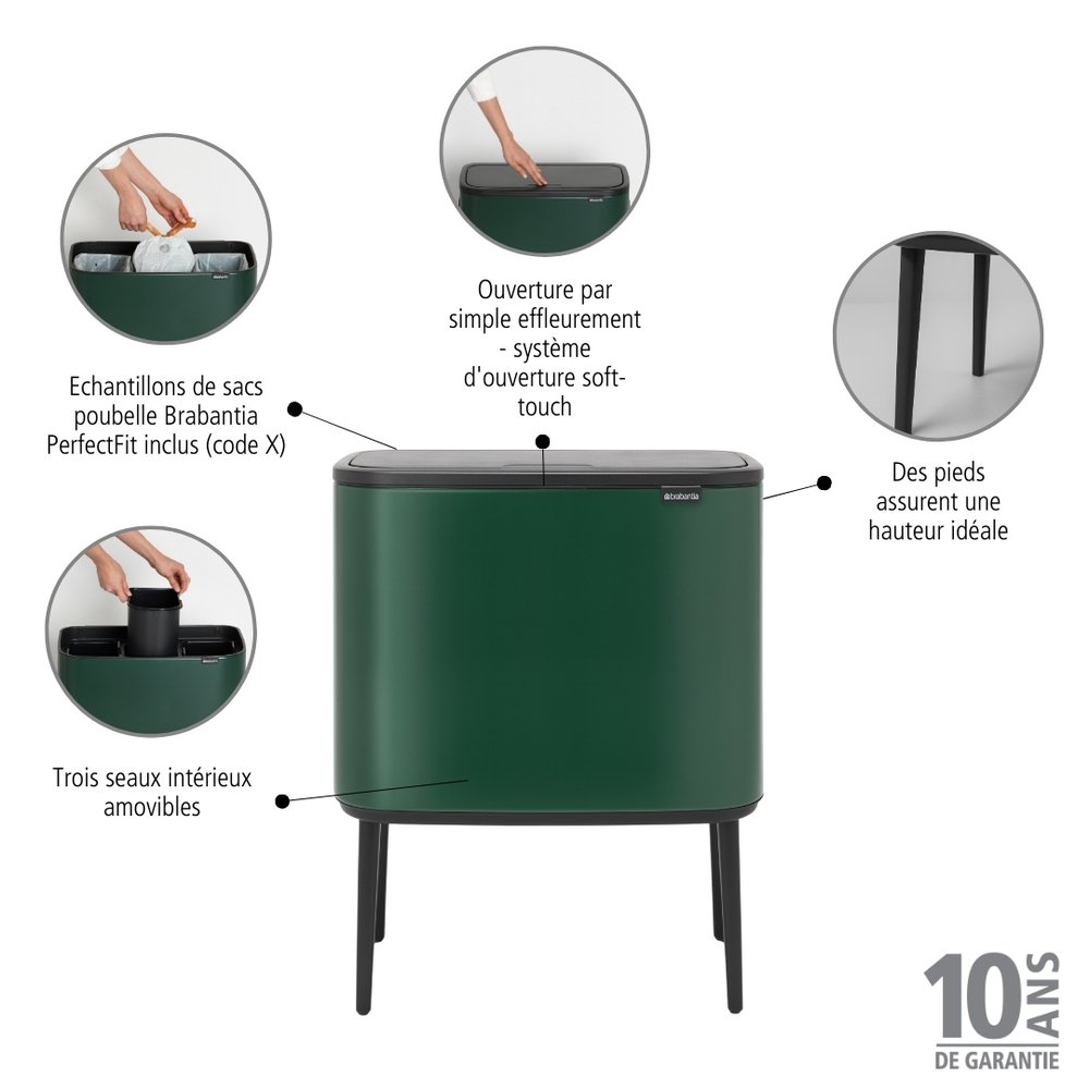 Brabantia Bo Touch Bin Afvalemmer - 3x11 liter - 3 kunststof binnenemmers - pine green